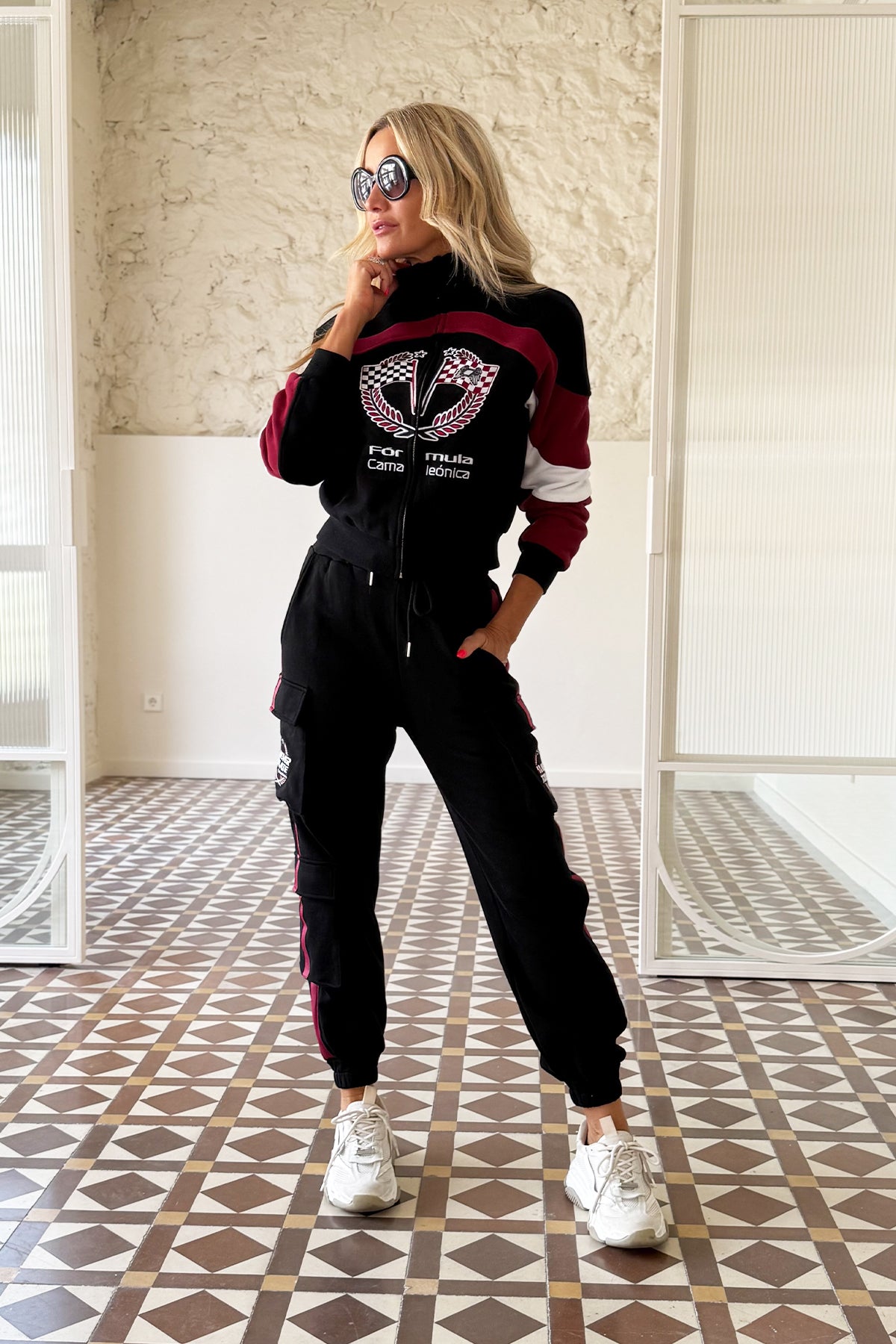 Esta cazadora estilo bomber, en elegante negro con toques burdeos y blanco, combina diseño y funcionalidad. Su cuello y puños engomados garantizan comodidad y ajuste. Con cremallera dorada frontal y bolsillo interior, ofrece practicidad sin perder estilo. Fabricada 100% en algodón, asegura transpirabilidad y durabilidad.