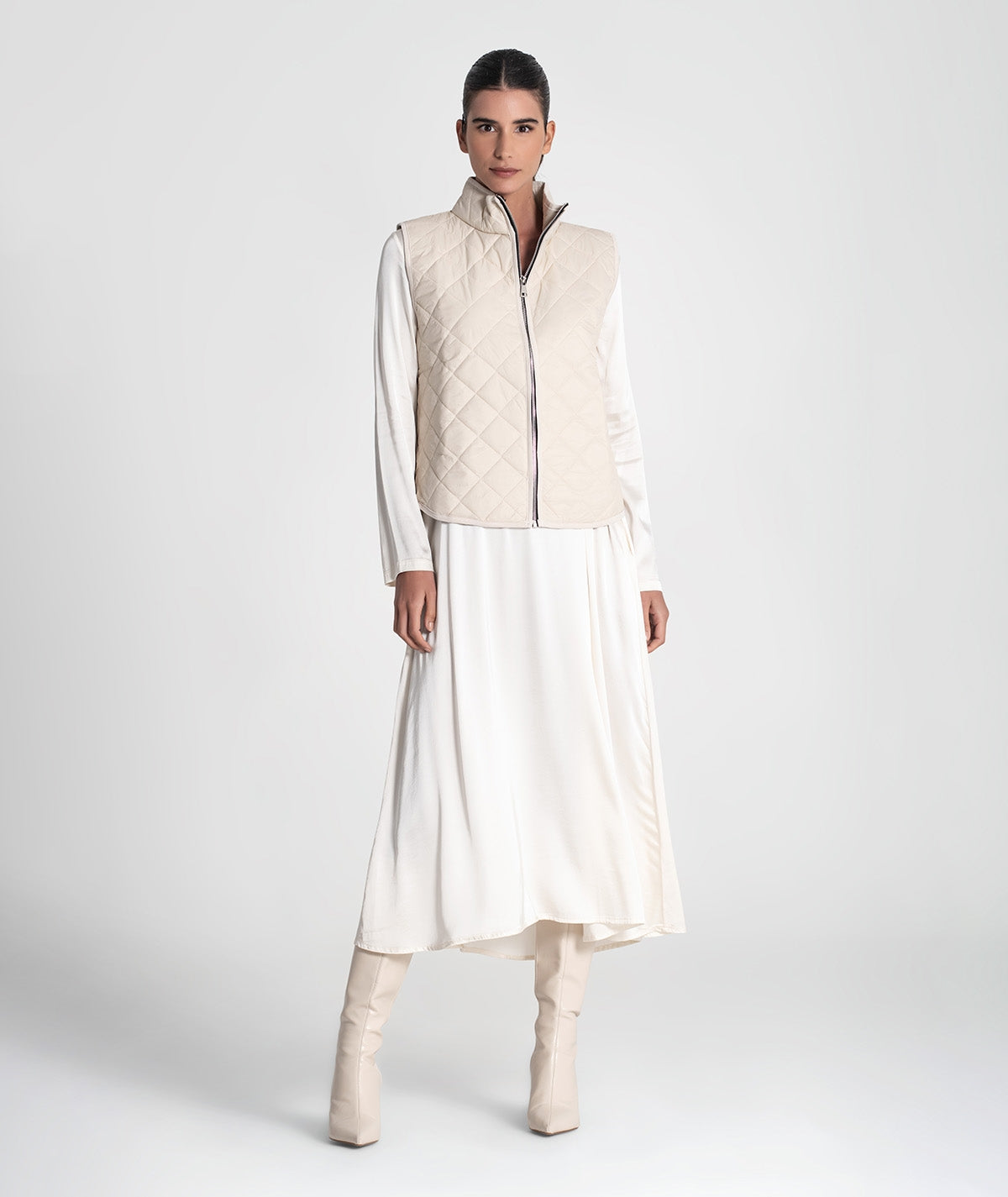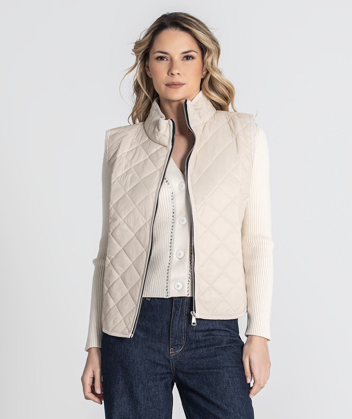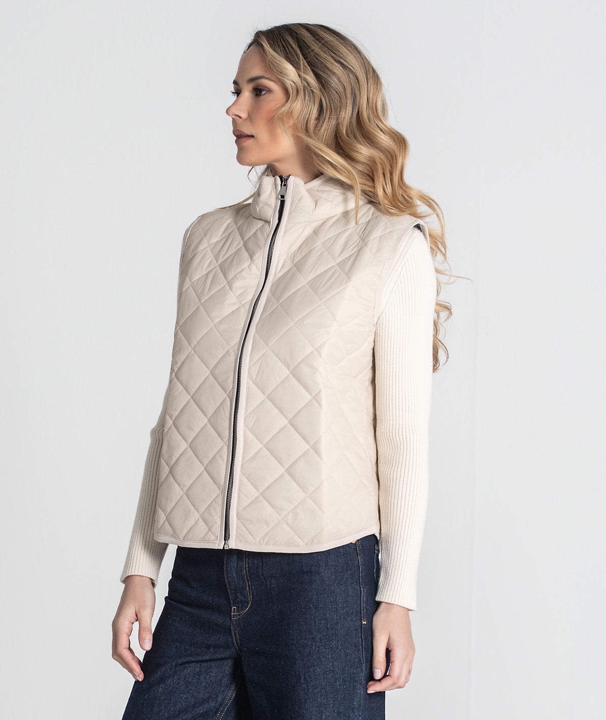 Chaleco acolchado en beige con cierre de cremallera, confeccionado en 100% poliéster. Diseño corto y versátil que se adapta a cualquier estilo, perfecto para capas ligeras en transiciones de temporada. La cremallera facilita el ajuste rápido, mientras que el acolchado proporciona calidez sin volumen excesivo. Una pieza esencial para crear looks modernos y funcionales.