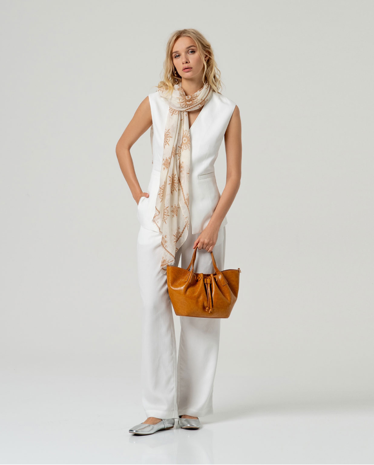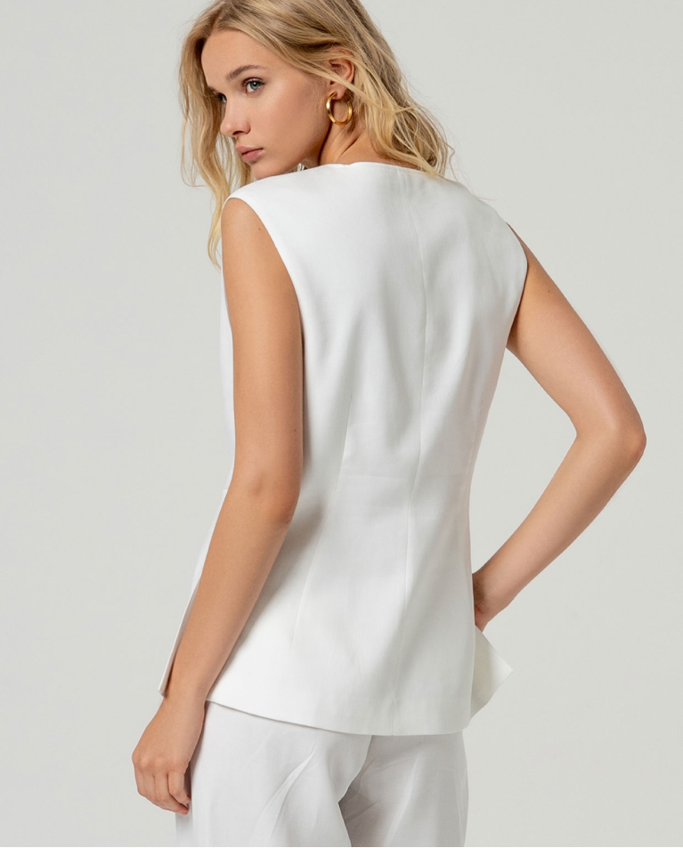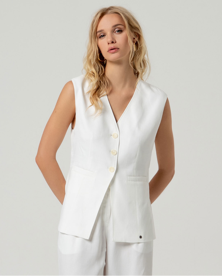 Chaleco versátil con escote en pico que favorece cualquier silueta. Diseño recto y desenfadado con cierre frontal de botones y bolsillos laterales funcionales. Confeccionado en una mezcla ligera de lyocell y lino, ofrece transpirabilidad y comodidad para el uso diario. Perfecto para capas versátiles en primavera y verano, combina con facilidad en looks casuales o más elaborados.