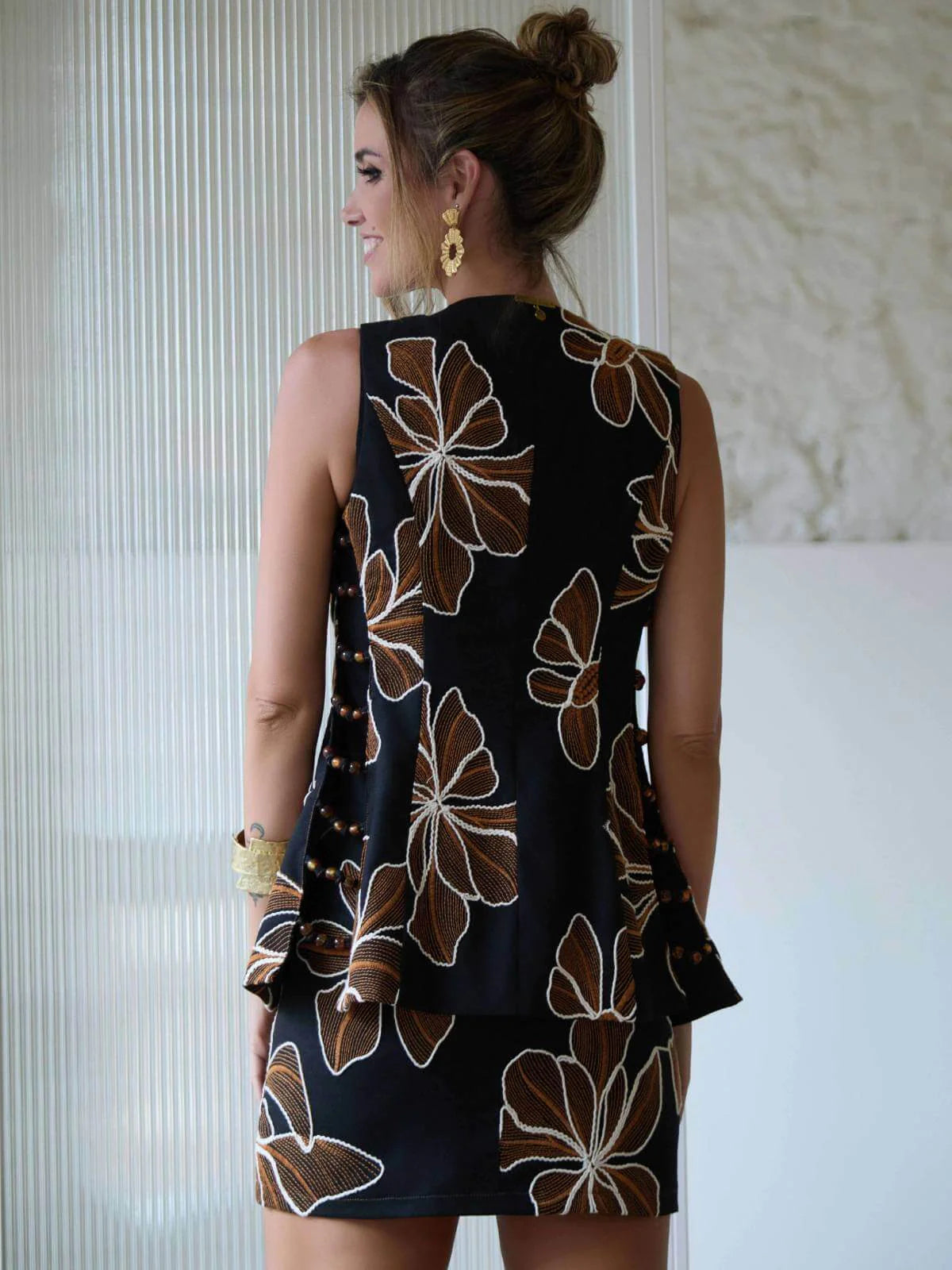 Chaleco negro de corte contemporáneo que fusiona elegancia y detalle artesanal. Presenta un escote en pico profundo y cierre de botones hasta el bajo, con laterales abiertos adornados con tiras decoradas con abalorios que añaden movimiento y textura. El frente destaca por grandes flores bordadas en hilo trenzado beige e hilo color caldera, creando un contraste visual sofisticado. La espalda cerrada luce la icónica chapa de Camaleónica en oro viejo, firma de la colección. Confeccionado en mezcla de algodón y poliéster (50% cada uno), ofrece comodidad y durabilidad. Pieza versátil que funciona tanto sobre camisetas básicas como sobre prendas más estructuradas, perfecta para crear looks con carácter.