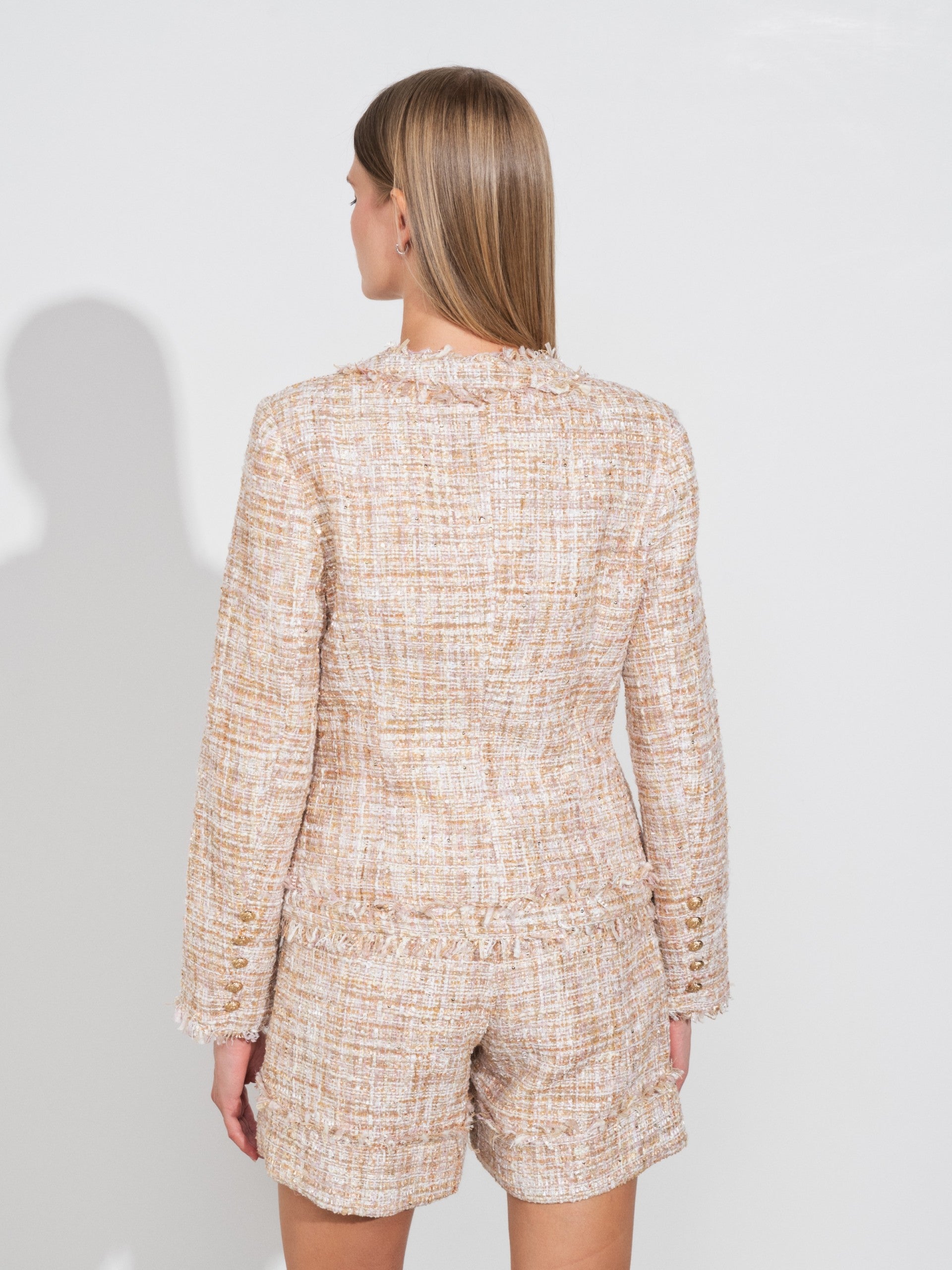 Esta chaqueta corta de estilo Chanel es perfecta para cualquier ocasión. Su diseño jaspeado en tonos rosa, salmón y marfil la hace elegante y sofisticada. Con su botonadura dorada, resaltará tu estilo y te hará lucir como una verdadera experta en moda. ¡No te quedes sin ella!
