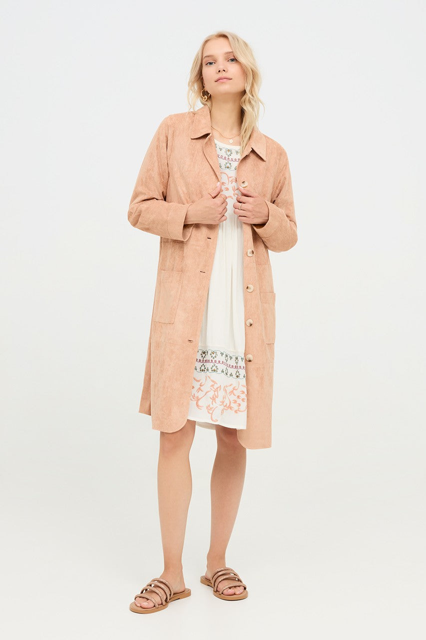 Chaqueta larga efecto ante, color beige, bolsillos delanteros