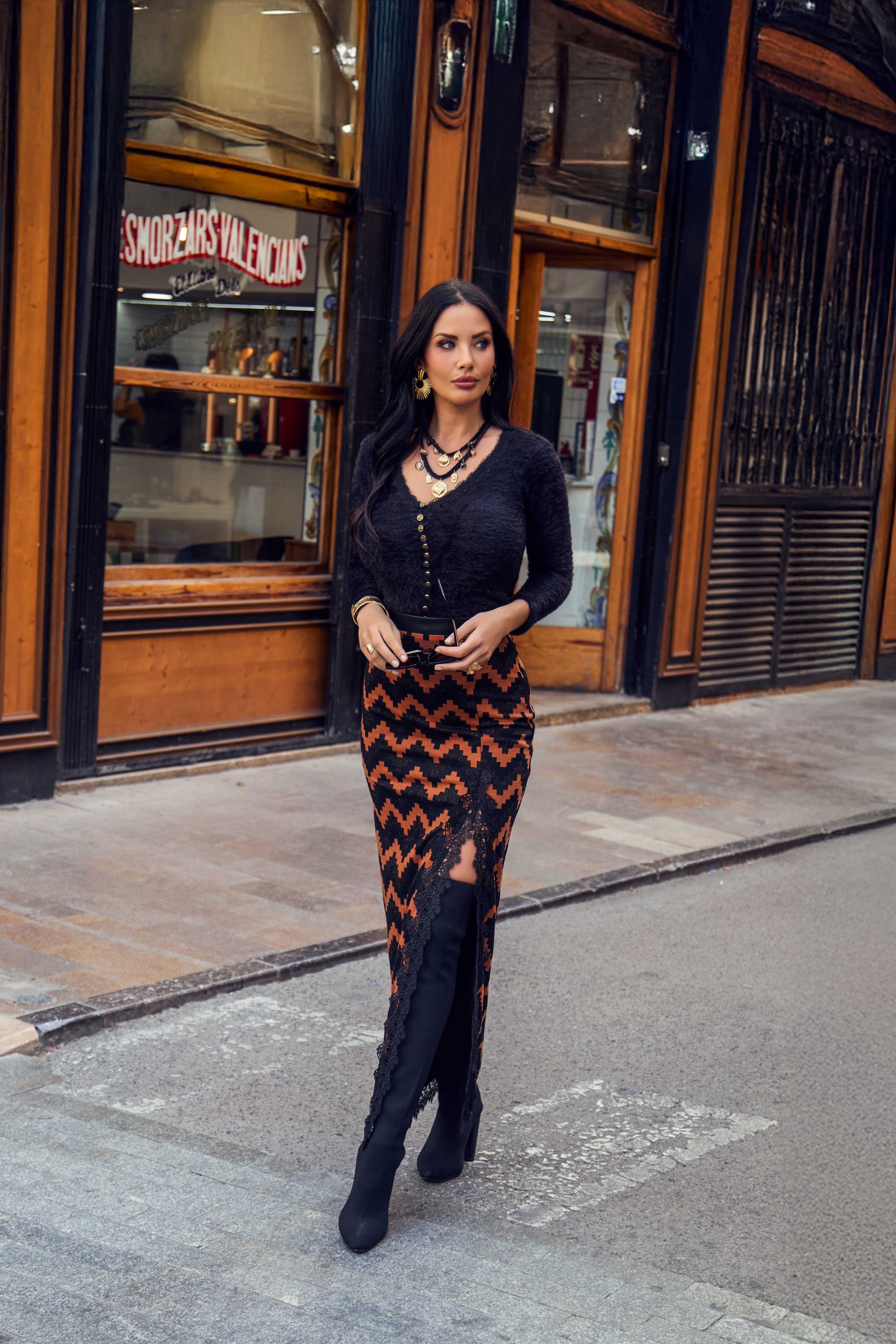 Falda larga que combina elegancia y movimiento con su estampado geométrico en tonos teja y negro realzado con detalles de purpurina. La abertura lateral y el bajo de puntilla aportan sofisticación, mientras que la cintura de ecopiel negra define la silueta. Cremallera invisible lateral para un ajuste perfecto. Confeccionada en una mezcla de poliéster, viscosa y elastano que garantiza comodidad y caída impecable.
