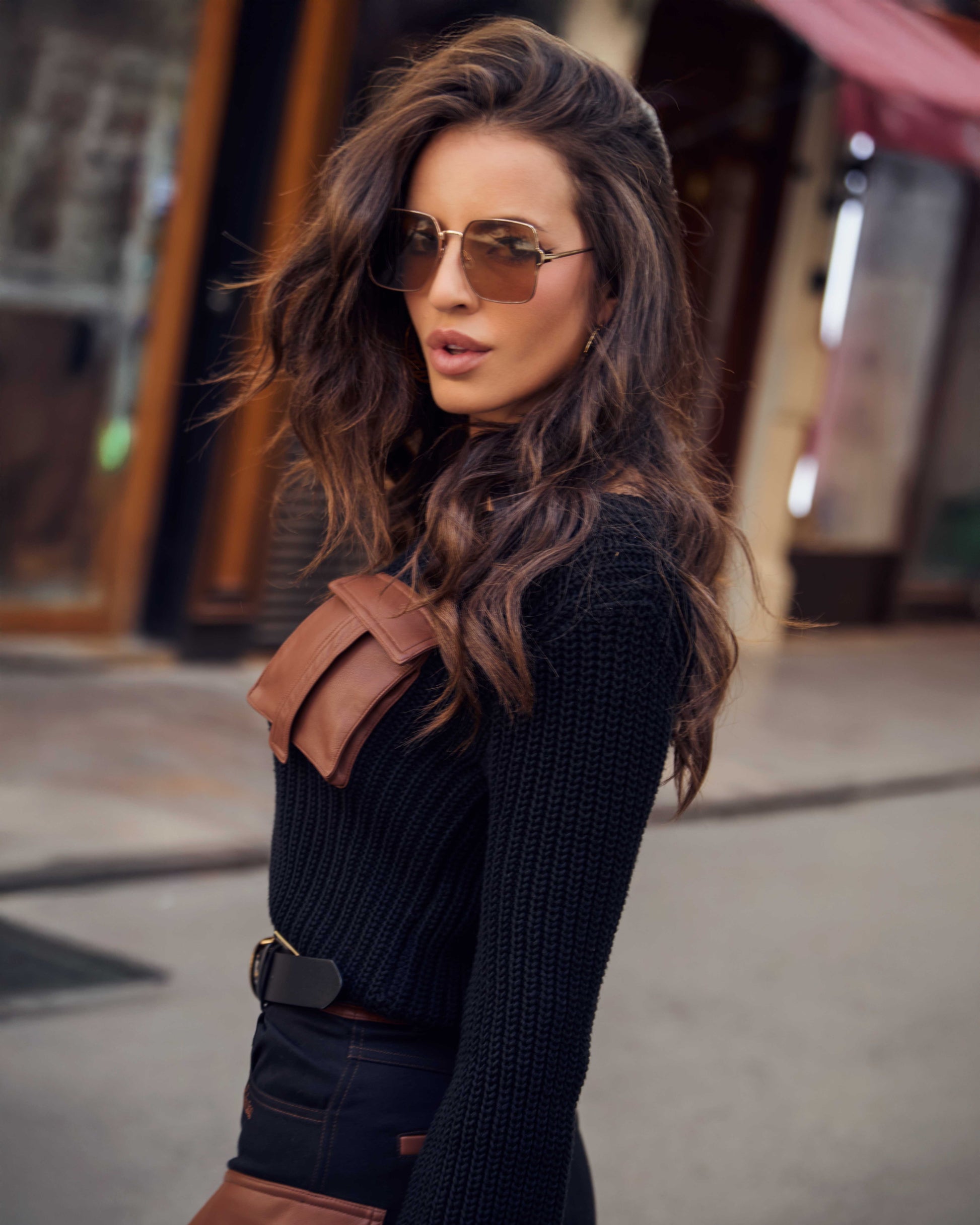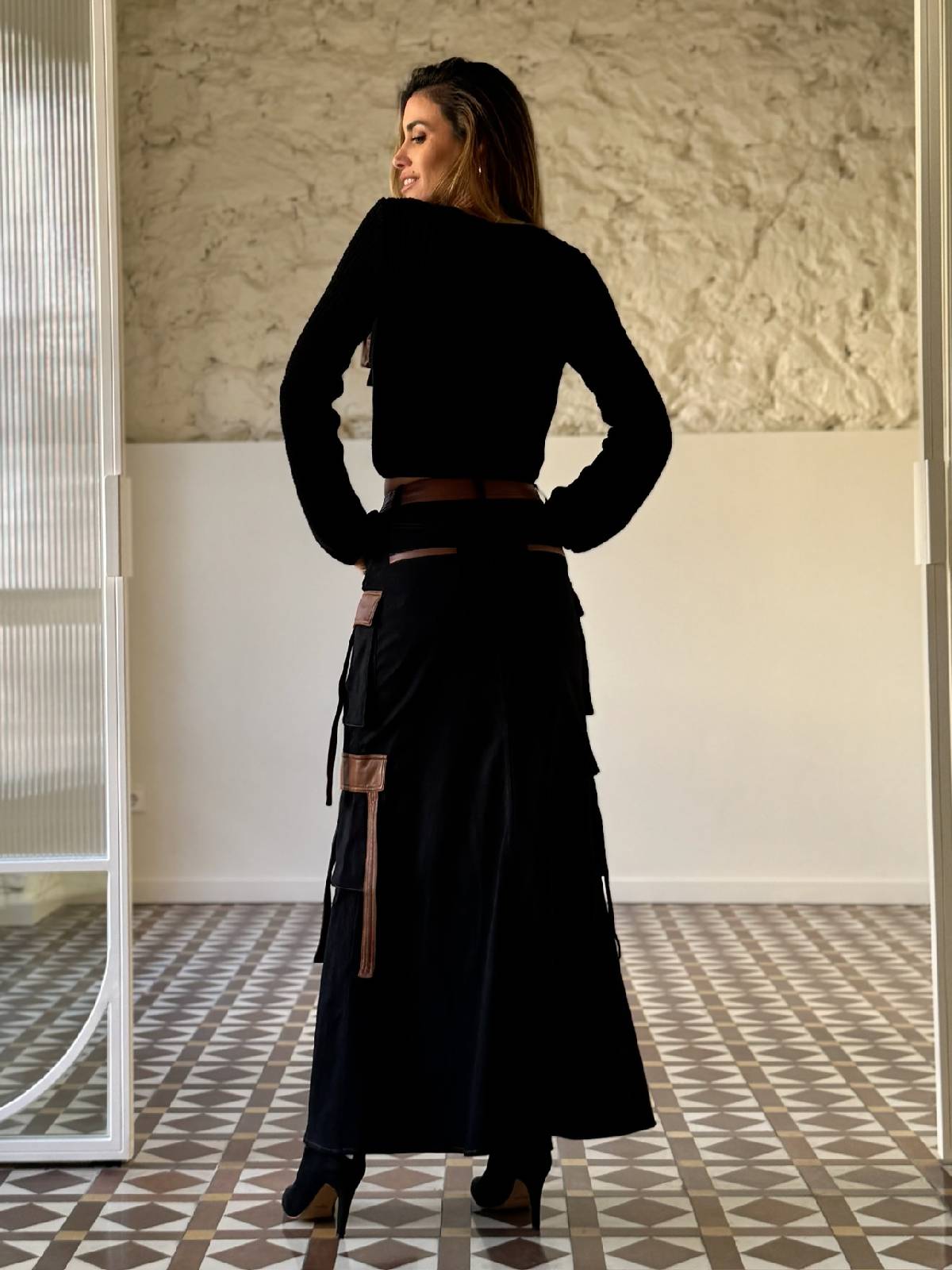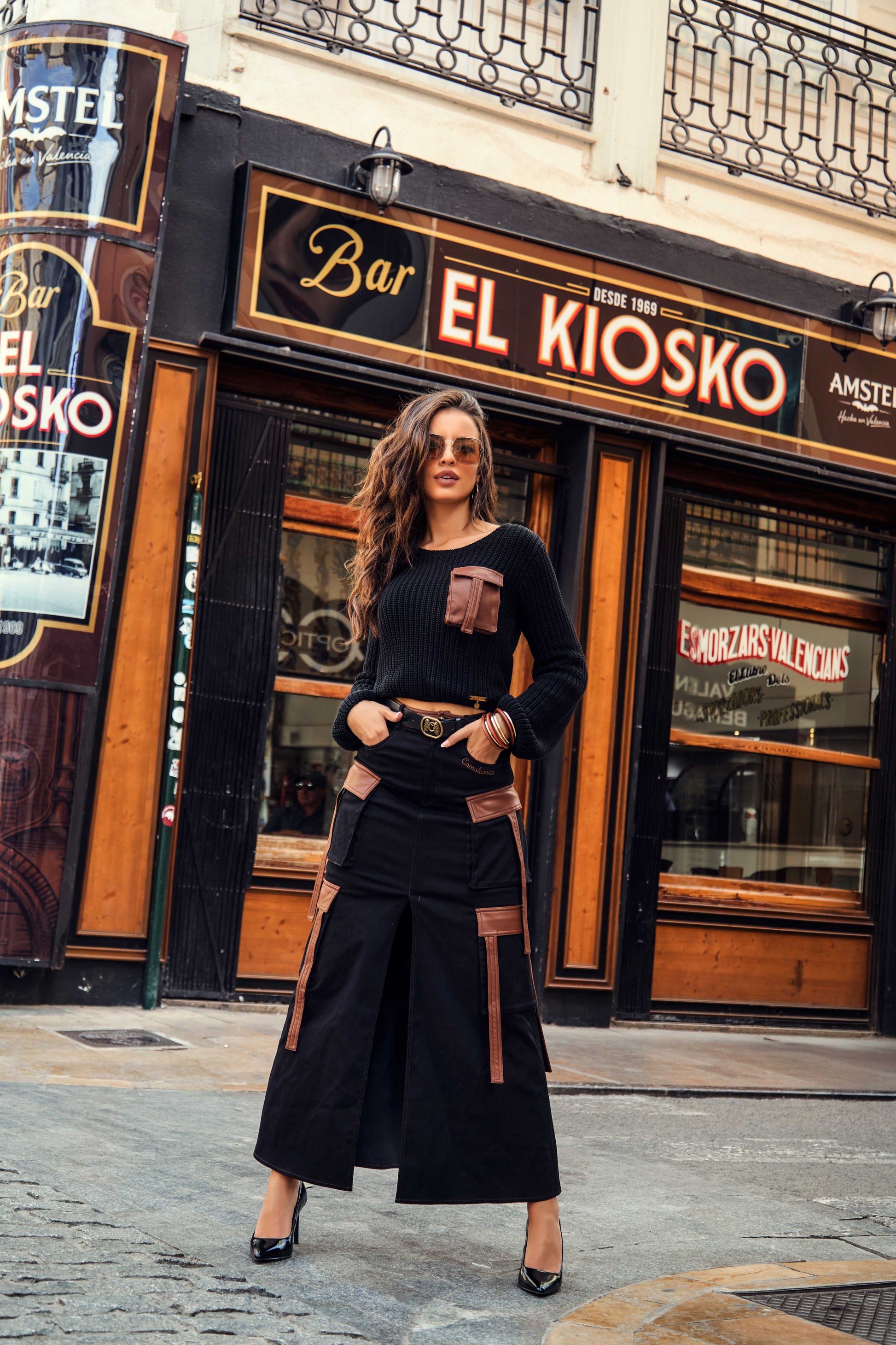 Jersey de punto en negro que combina comodidad y estilo contemporáneo. Destaca por sus mangas acampanadas que aportan movimiento y elegancia, complementadas con un bolsillo funcional en ecopiel marrón en la parte delantera. Cuello redondo clásico que favorece cualquier tipo de rostro. La composición de algodón y acrílico garantiza una prenda cálida, resistente y fácil de mantener, perfecta para crear looks versátiles en tu día a día.