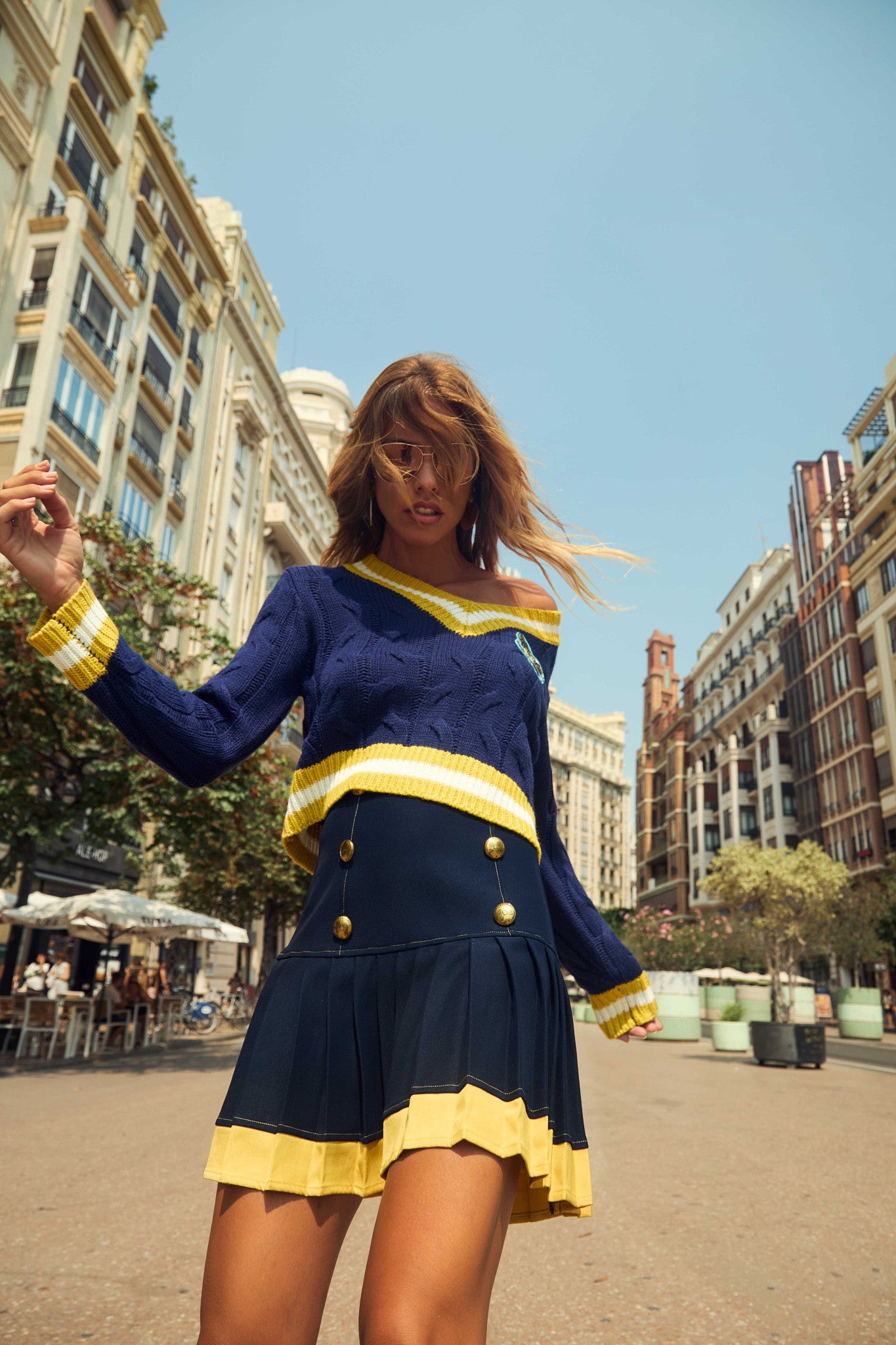 Este jersey en azul y amarillo destaca por su elegante escote en pico, que realza la silueta con un toque sofisticado. Su diseño combinado aporta un aire fresco y versátil, ideal para quienes buscan una prenda que combine confort y estilo refinado en cualquier ocasión.