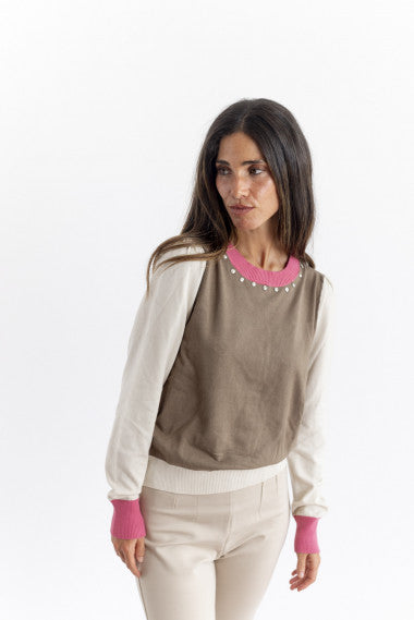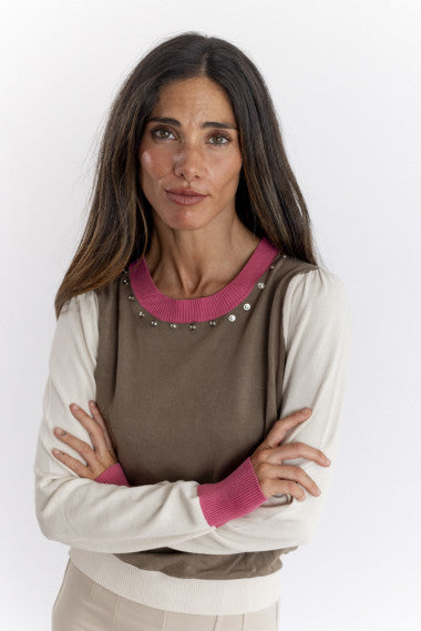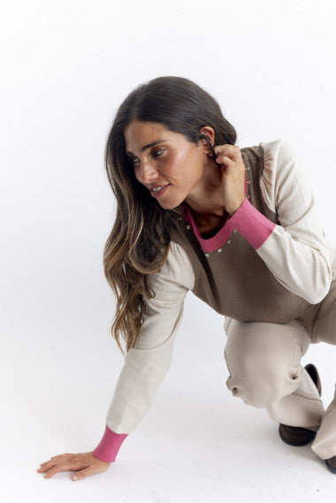 Jersey de punto fino con un diseño tricolor que combina camel, beige y rosa en una propuesta sofisticada. Cuello redondo adornado con tachas . Mangas largas con puño en canalé ancho y efecto ligeramente abullonado para mayor volumen. Los detalles en rosa en puños y escote crean contraste visual. Una pieza versátil para crear looks refinados en cualquier ocasión.