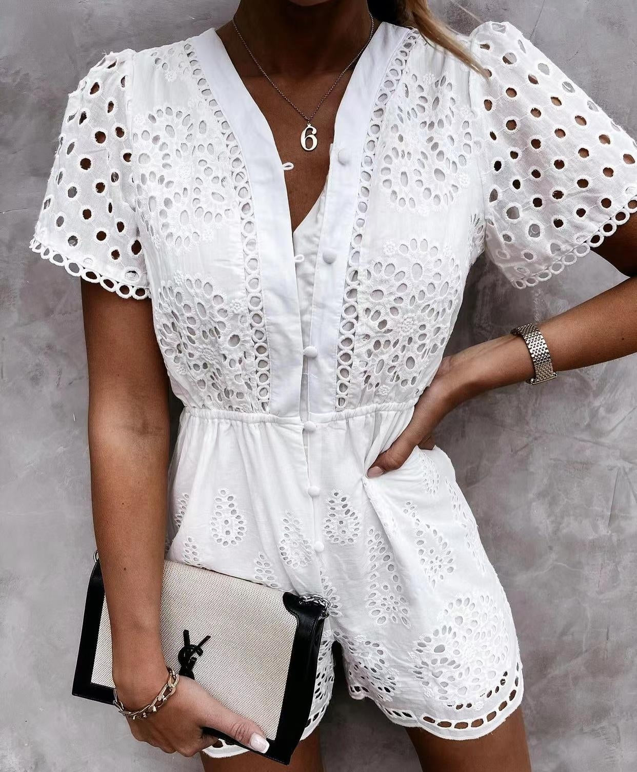 Mono corto, color blanco, en algodón bordado perforado, forrado, con escote a pico y botonadura delantera, manga corta, cintura engomada.Es talla única que se adapta desde la 38 a la 42