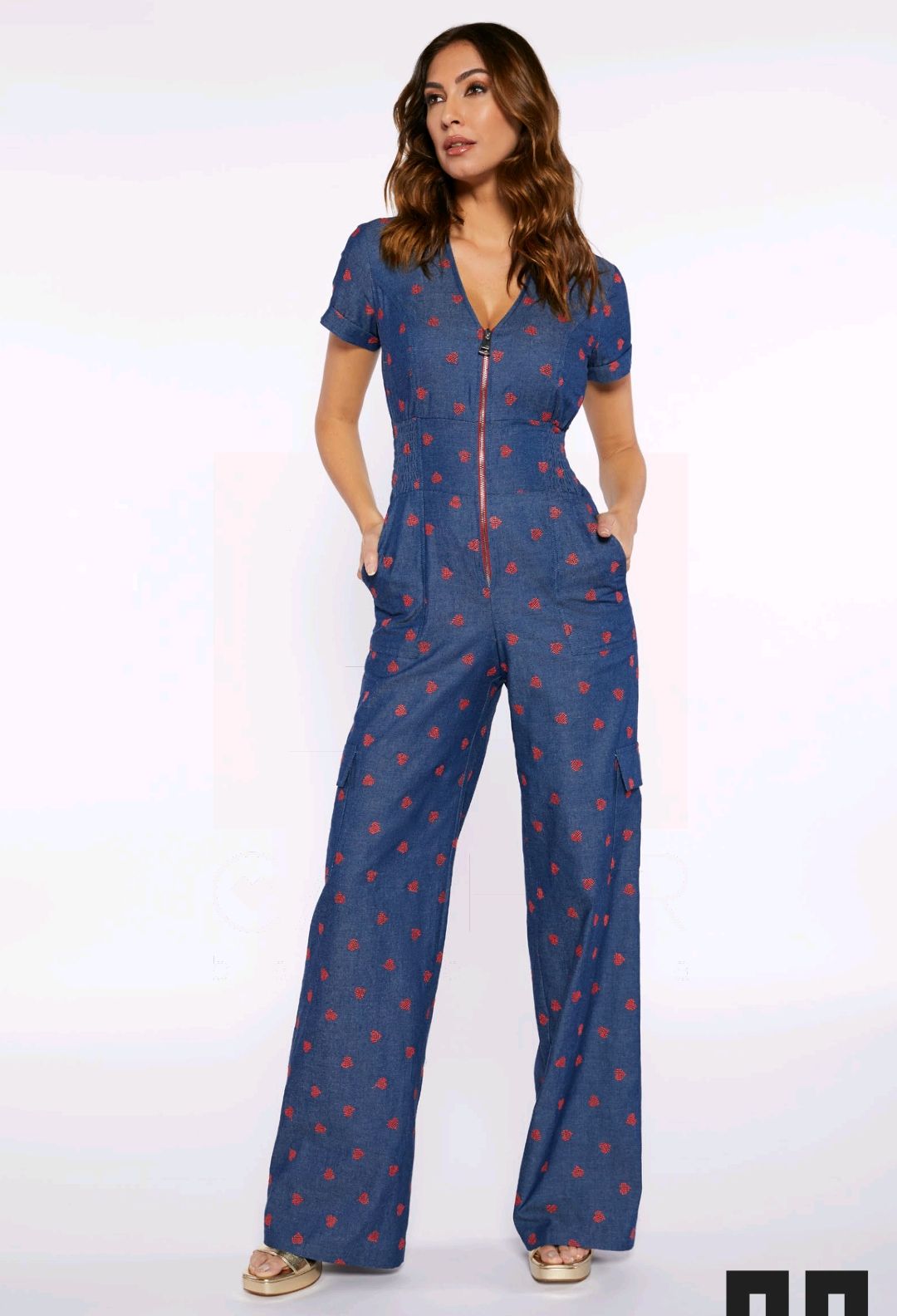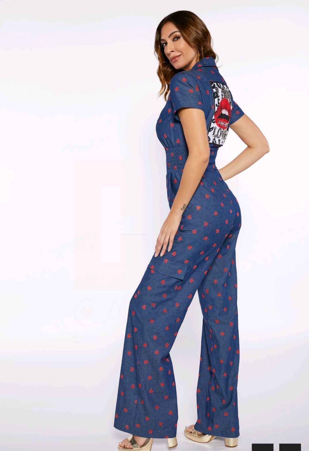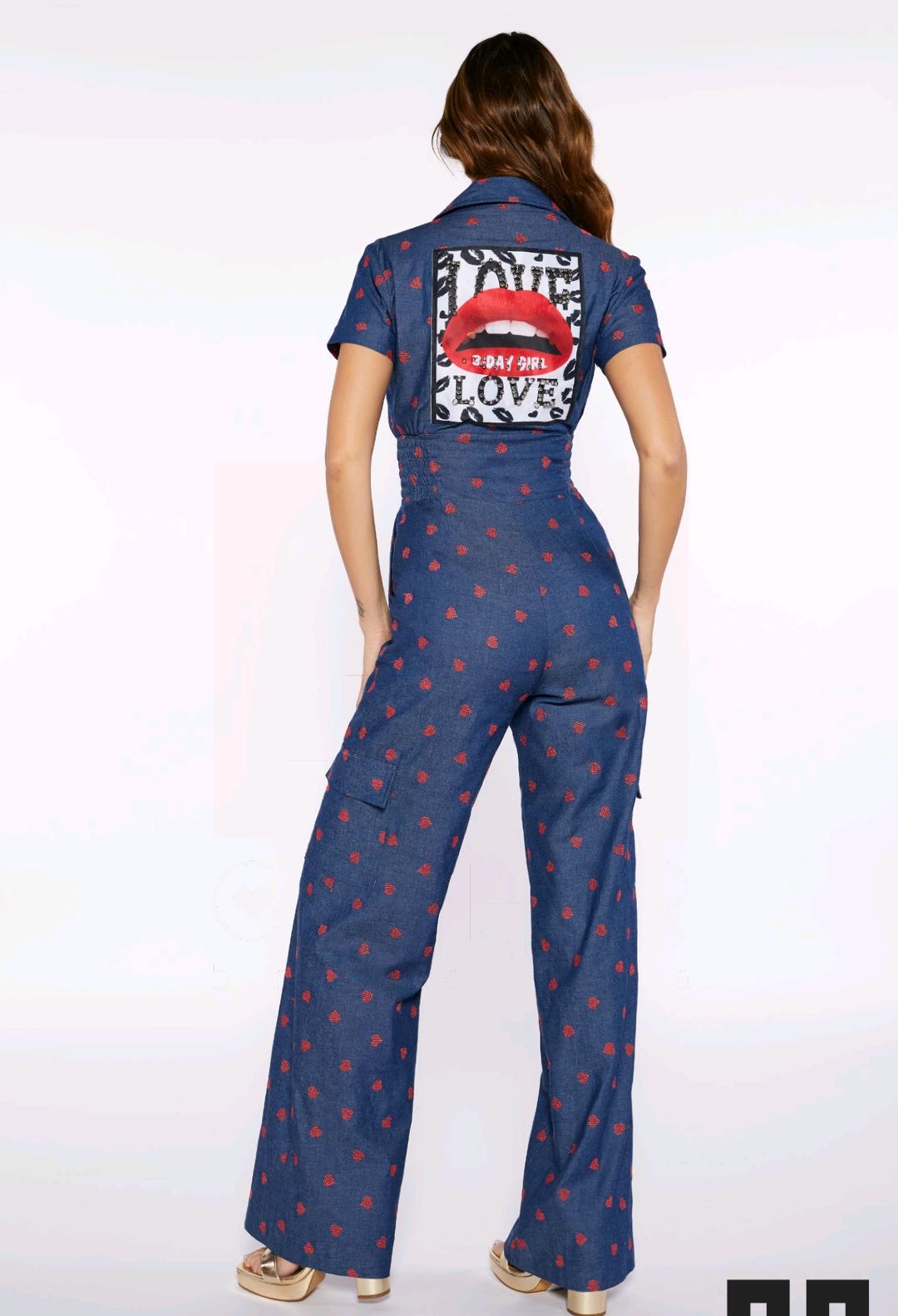 Añade un toque de estilo y comodidad a tu guardarropa con nuestro mono vaquero de pata ancha. Con bolsos cargo y detalles de pedrería en la espalda, este mono estampado en azul con corazones rojos es perfecto para cualquier ocasión. ¡Haz una declaración de moda con este mono único y de tendencia!