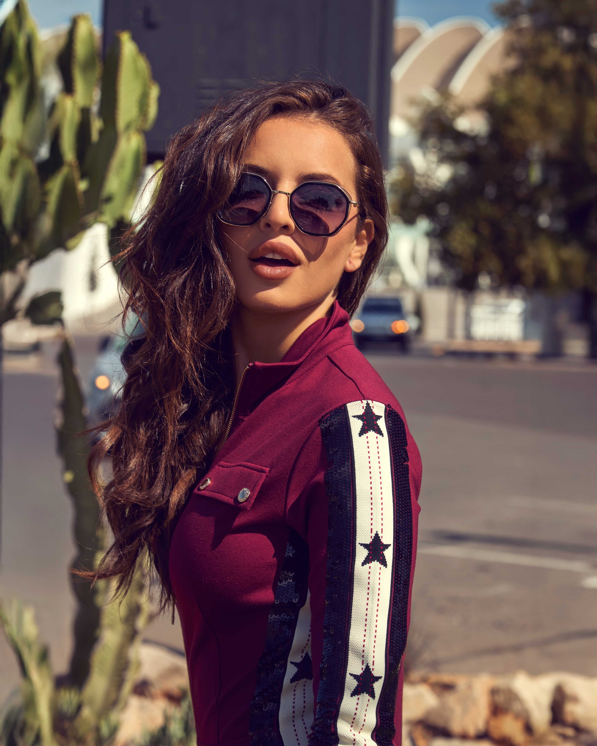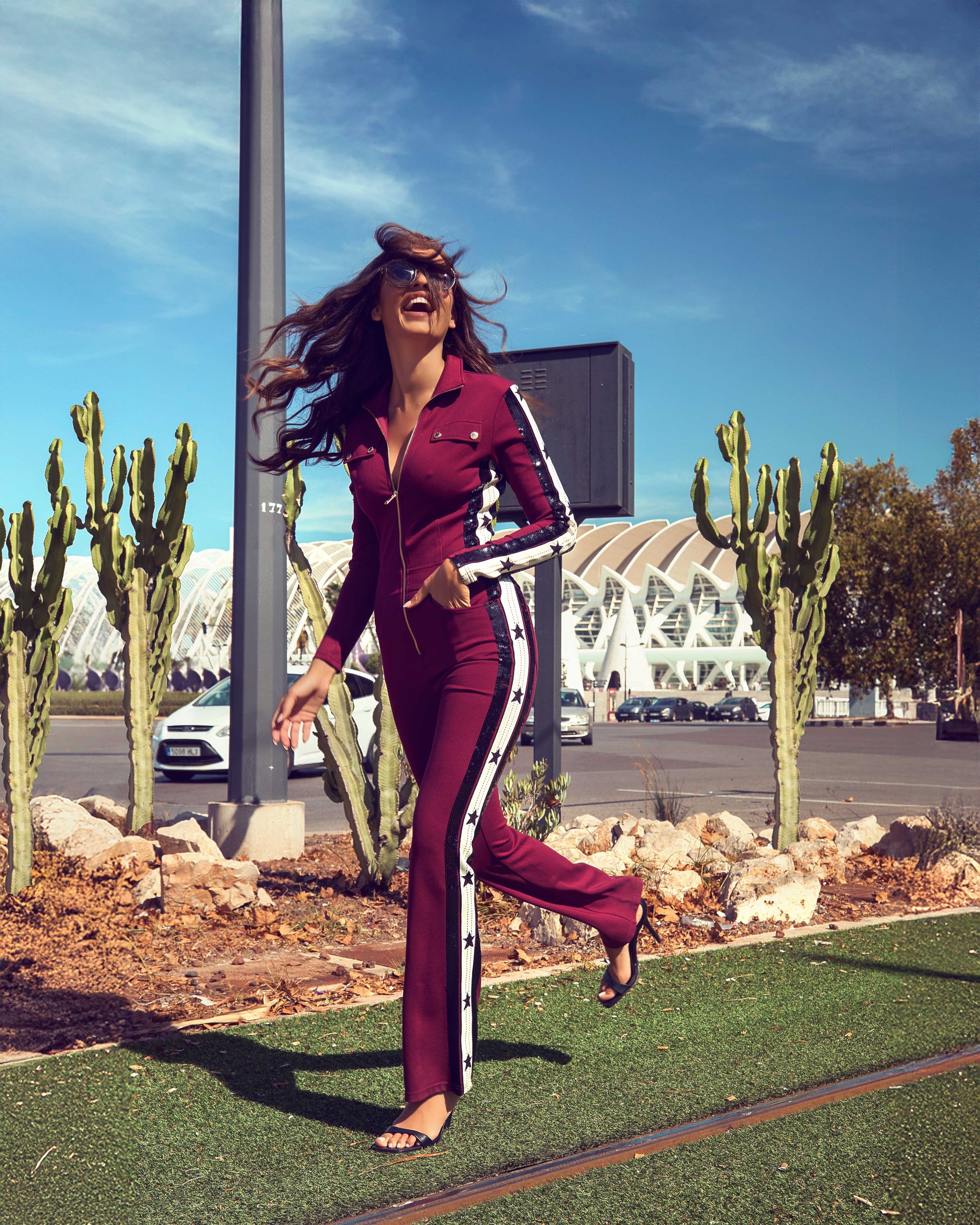 MONO ROMERO CAMALEÓNICA Mono largo en viscosa y poliamida que combina elegancia con un toque festivo. El color burdeos profundo se realza con detalles de lentejuelas estratégicamente distribuidos en mangas y laterales de las piernas, creando movimiento con cada paso. La cremallera central dorada añade un elemento sofisticado, mientras que la doble solapa en el cuerpo proporciona estructura y dimensión. El pantalón acampanado favorece la silueta, complementado por bolsillos funcionales tanto delanteros como traseros. El bordado del logo de marca en la espalda certifica autenticidad. La composición de 65% viscosa, 30% poliamida y 5% elastano garantiza comodidad y elasticidad