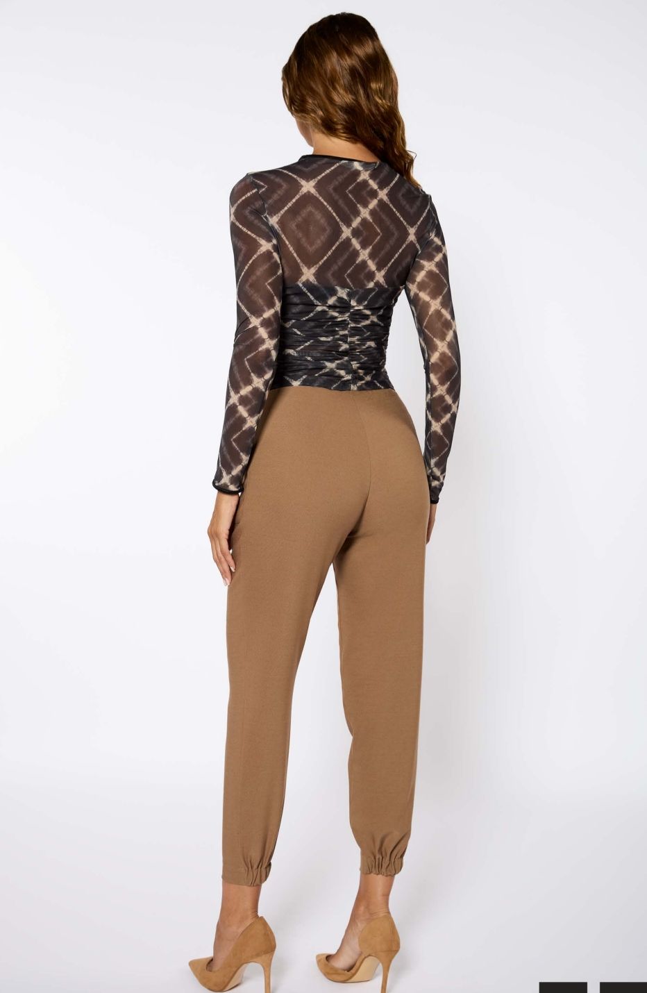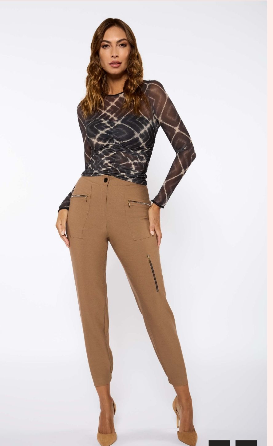 Pantalón Carla, elegante y práctico. Con bolsillos laterales y cremallera dorada. Goma por detrás del tobillo. Combina estilo y comodidad gracias a su cintura elástica. Disponible en color beige.