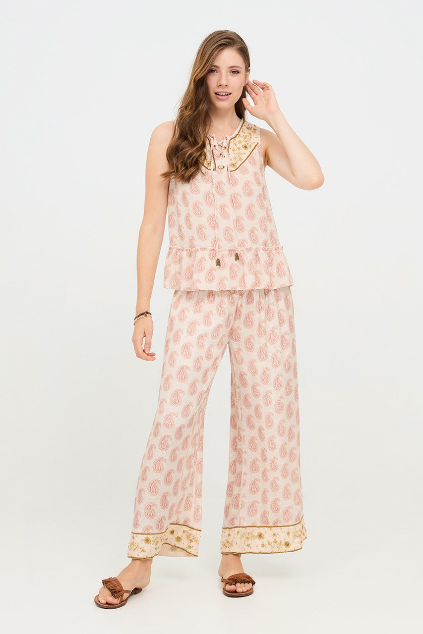 Pantalón de pata ancha con greca de abalorios , cintura de nido de abeja y lazada, tejido fluido estampado paisley