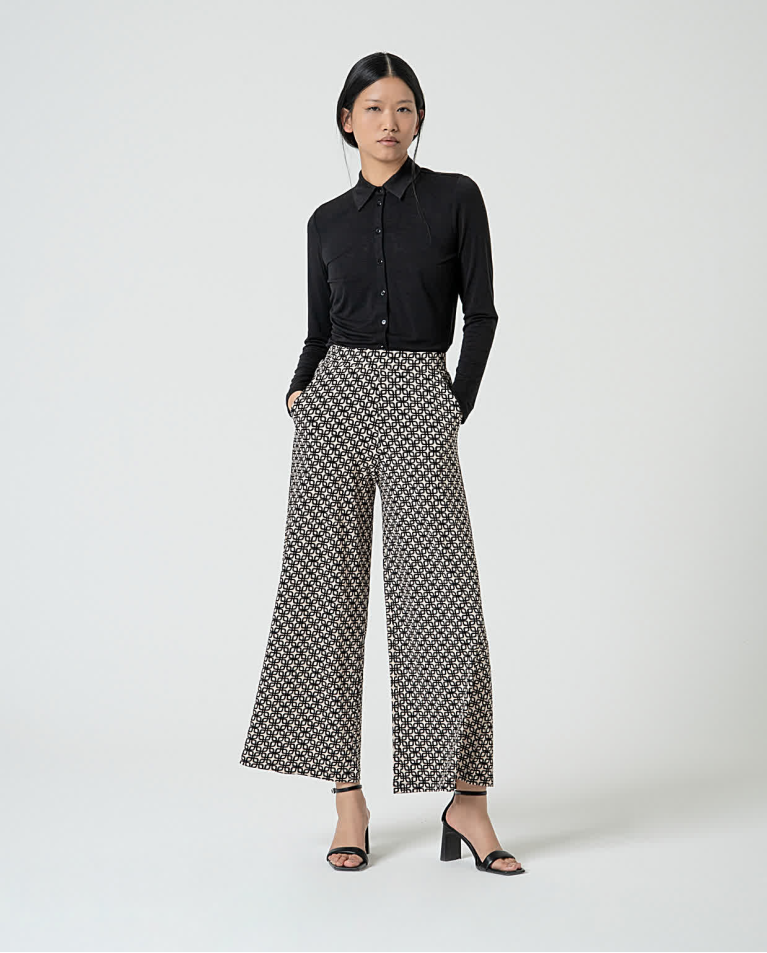 Pantalón Odet es el pantalón perfecto para lucir elegante y cómoda. Con su pata amplia y engomado en la cintura, brinda un ajuste cómodo y favorecedor. Su estampado en negro y color hueso te hará destacar con estilo en cualquier ocasión. ¡Haz una declaración de moda con Pantalón Odet!