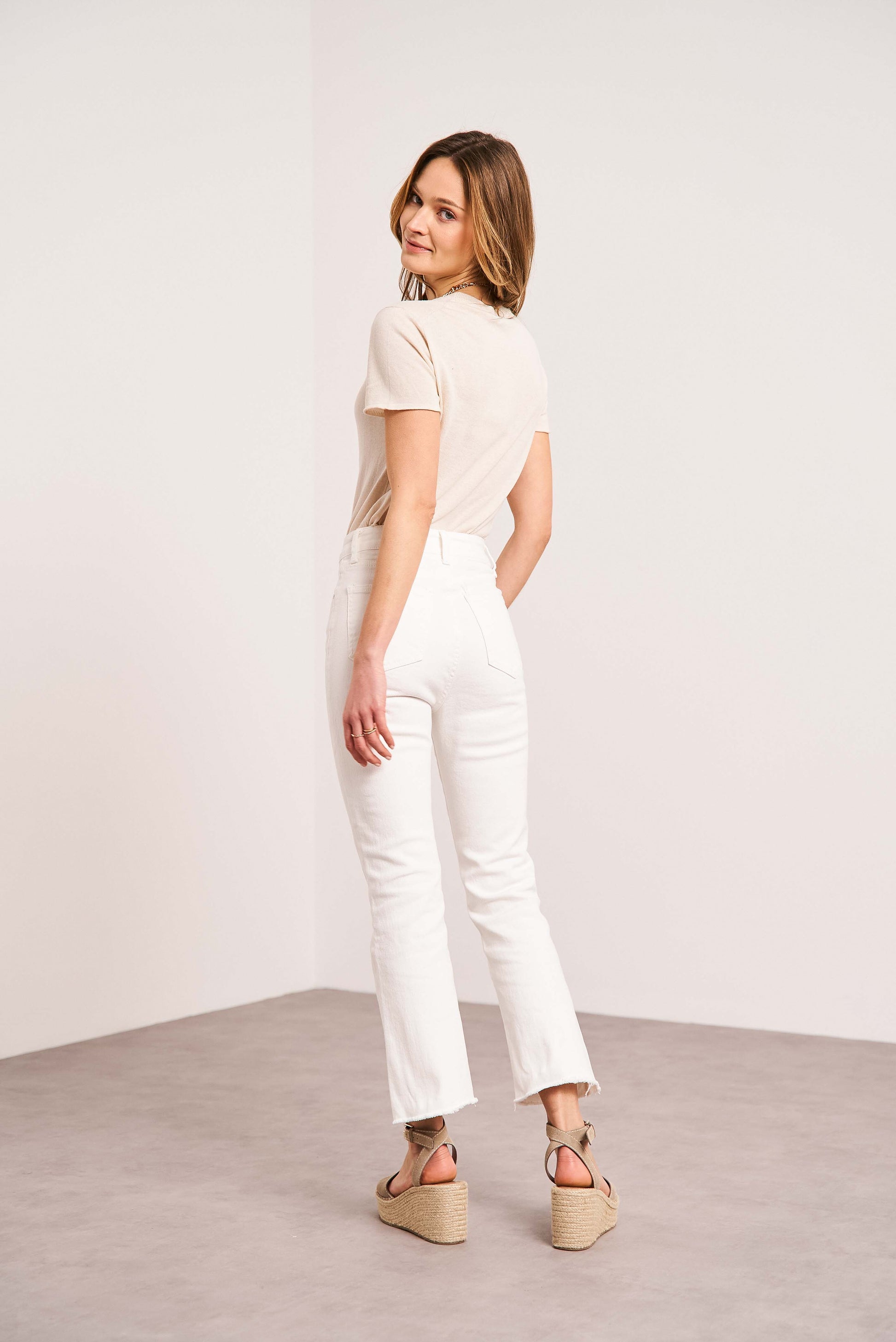 Pantalón vaquero de cinco bolsillos,blanco, con remate de fleco, pata campana