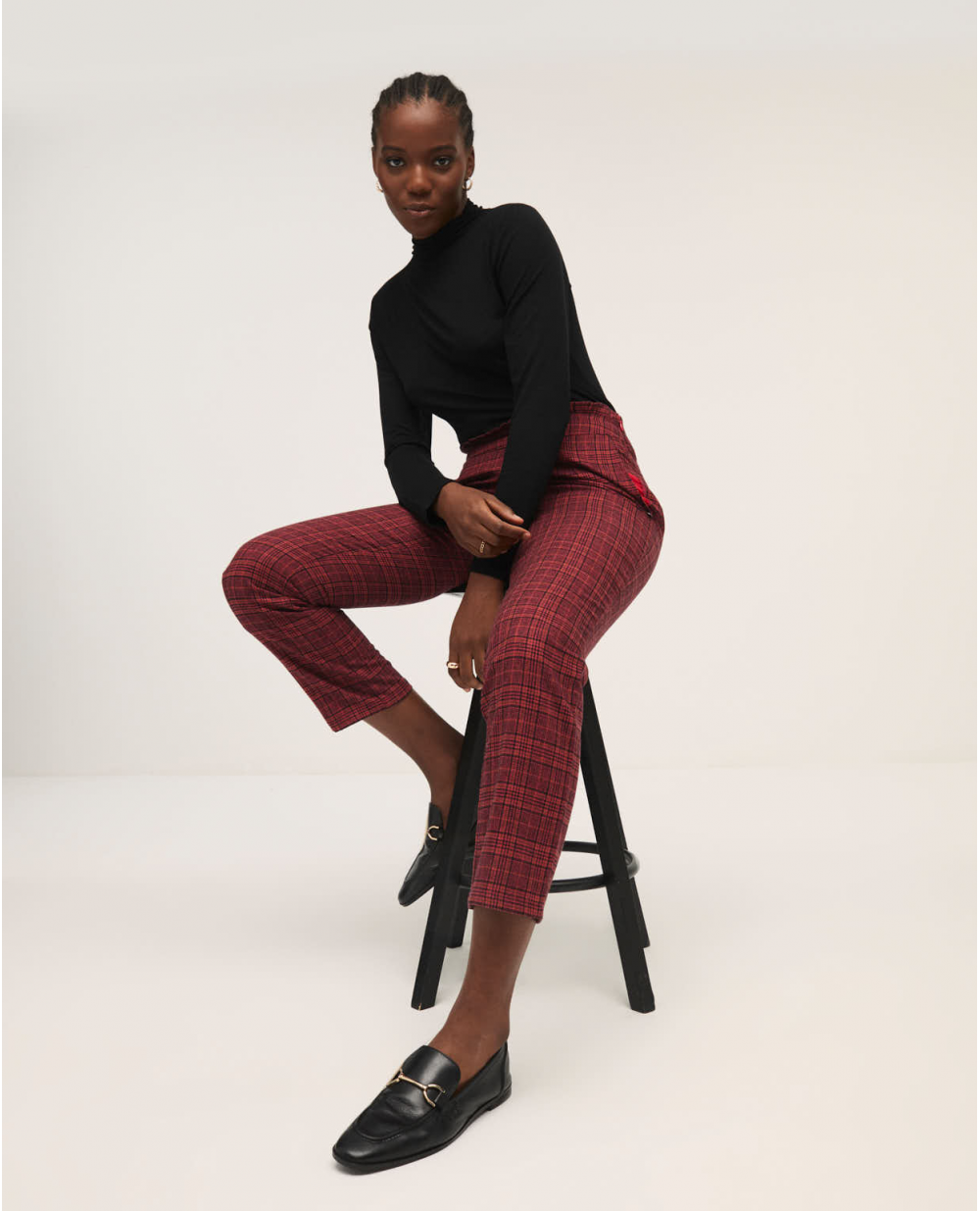 Pantalón elástico, engomado en la cintura, cremallera lateral, bolsillos laterales en diagonal, estampado de cuadros