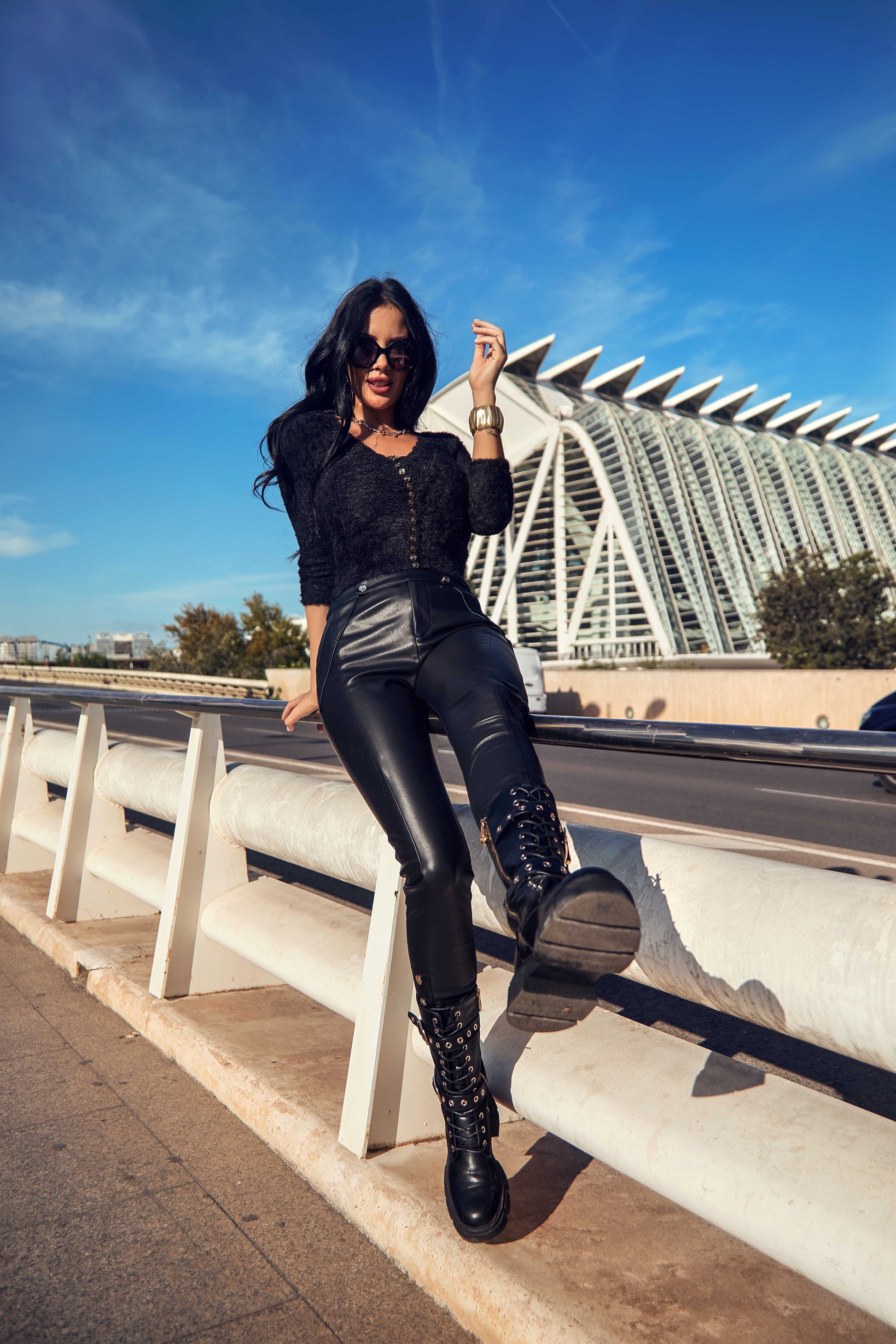 Pantalón de ecopiel negro con corte recto y cintura alta que combina estilo y funcionalidad. Confeccionado en una mezcla de poliéster y poliuretano, ofrece durabilidad y un tacto suave. Destaca por sus botones dorados tanto en la cintura como en el bajo, aportando un toque sofisticado. Equipado con forro térmico para mayor confort en días fríos, cierre de botones y cremallera para máxima seguridad. Una pieza versátil que se adapta a diferentes ocasiones, desde looks casuales hasta más elaborados.