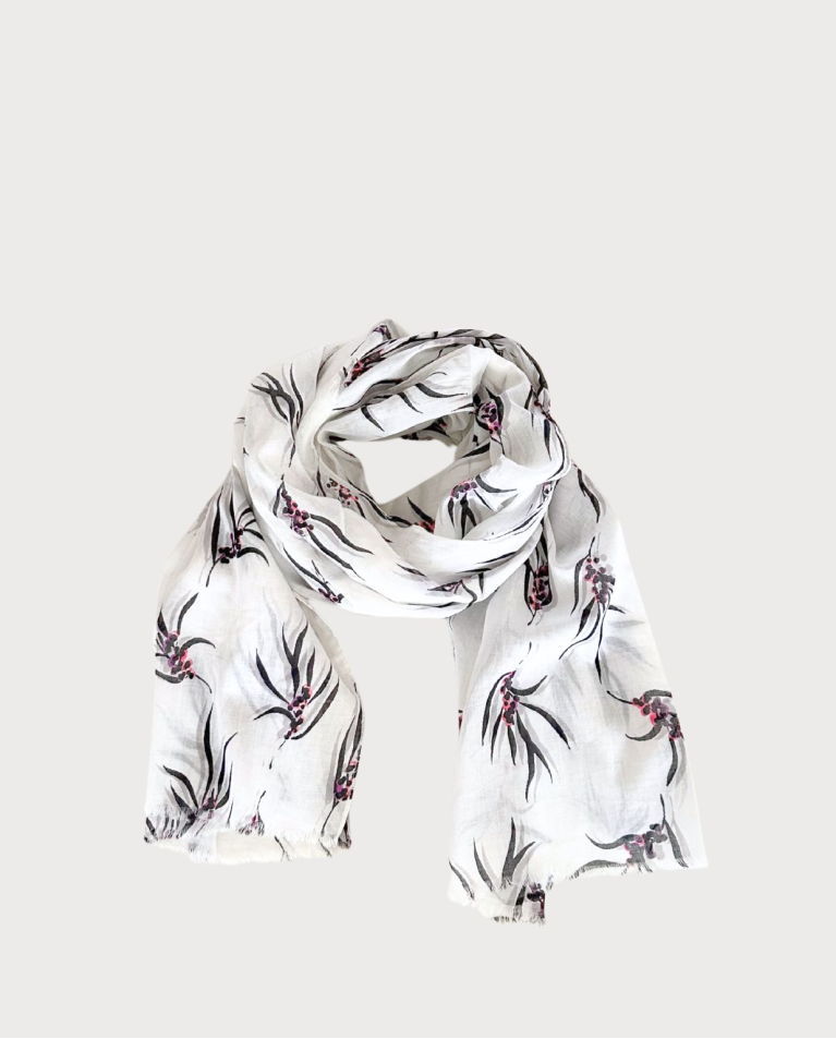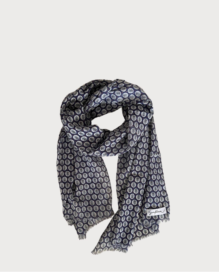 Pañuelo rectangular confeccionado en tejido ligero con estampado . Diseño con flecos cortos en los extremos