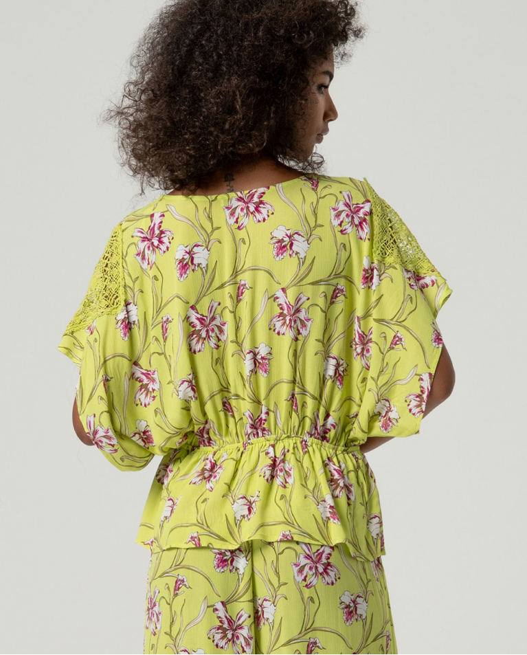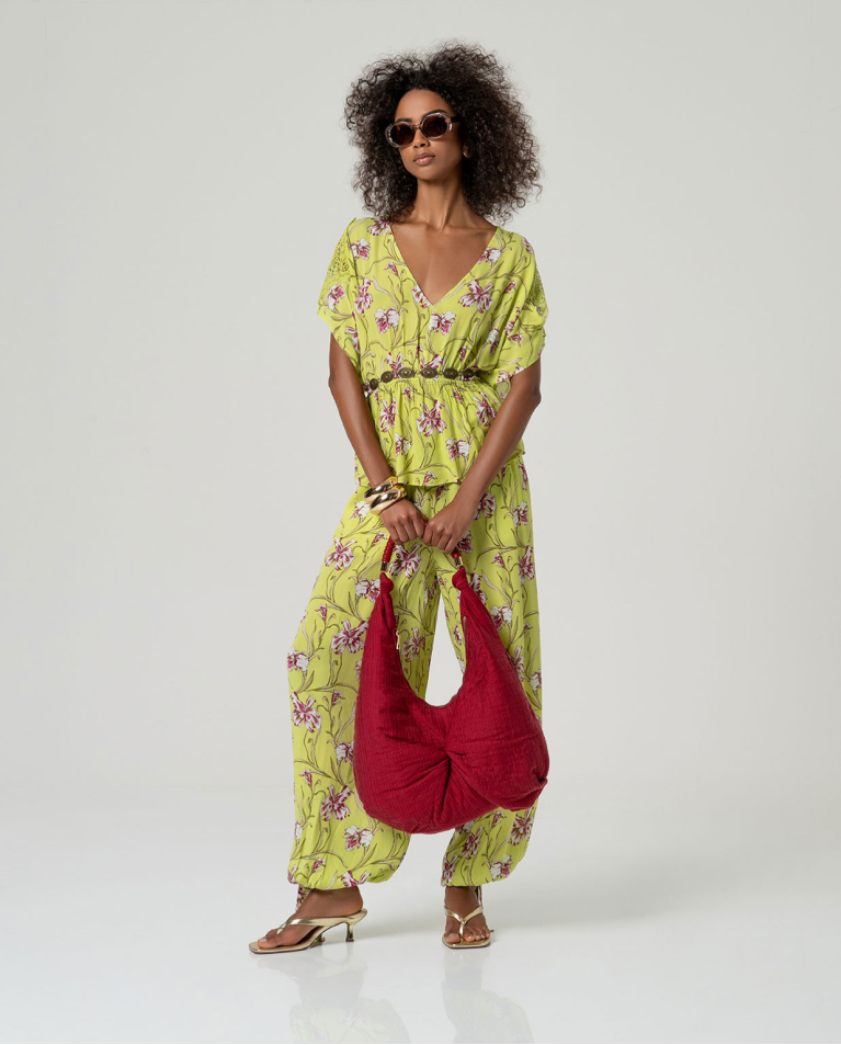 Descubre el TOP KIBA, una prenda versátil que combina comodidad y estilo. Con escote en pico que favorece, mangas tipo kimono generosas y una silueta amplia que fluye con elegancia. La cintura elástica fruncida define tu forma de manera natural, mientras que el estampado floral añade un toque de frescura. Confeccionado en viscosa ligera, es la opción perfecta para días cálidos y looks desenfadados. Su bajo recto proporciona un acabado limpio y moderno.