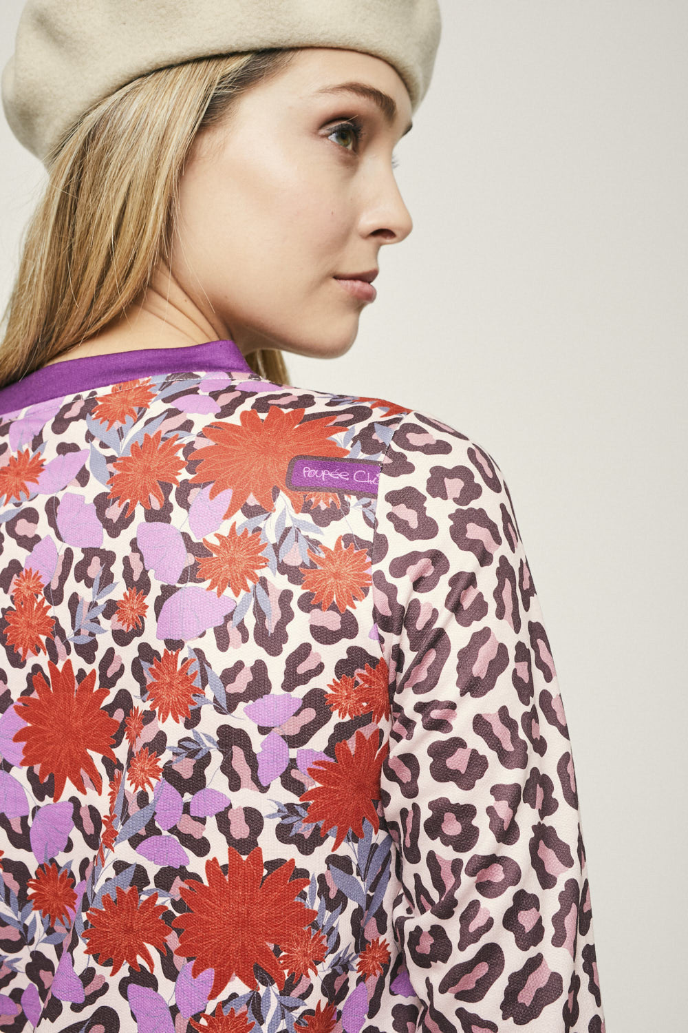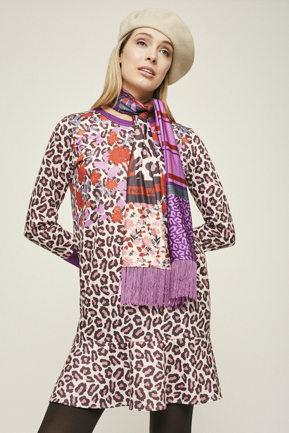 Vestido corto ,con volante, manga larga, cuello redondo, estampado en animal print