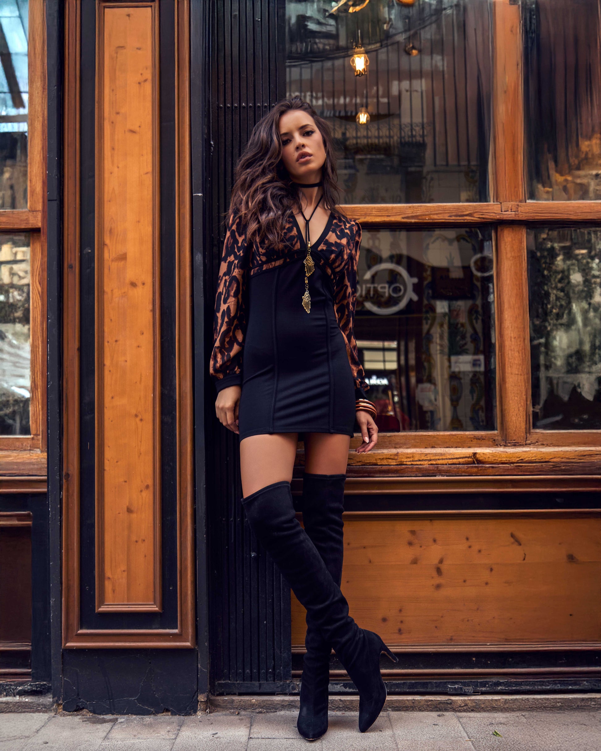 Vestido corto ajustado que combina texturas y patrones con elegancia sofisticada. La parte superior presenta gasa con estampado animal print, mientras que la inferior simula neopreno en negro, creando un contraste visual cautivador. Destaca por su escote en pico, puños negros rematados con botón dorado y doble costura reforzada en la falda para mayor durabilidad. Cierre mediante cremallera invisible lateral que facilita el ajuste perfecto. Confeccionado en viscosa, poliamida y elastano, ofrece comodidad y flexibilidad en cada movimiento.