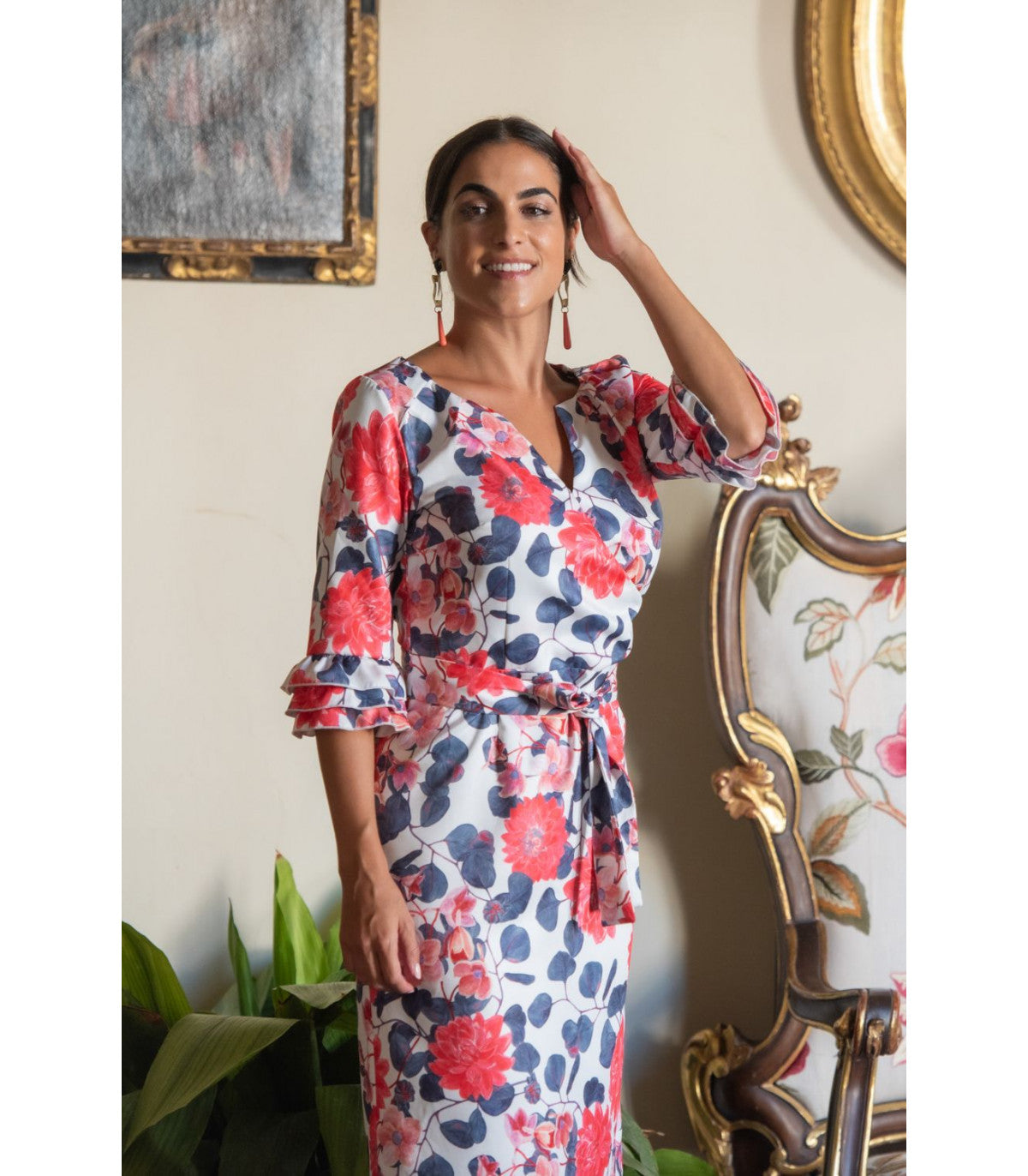 El vestido Jana es perfecto para lucir este verano con su estampado floral y su elegante escote a pico cruzado. Las mangas francesas con volantes añaden un toque romántico a este hermoso vestido. Con estilo y comodidad, este vestido te hará lucir radiante en cualquier ocasión.