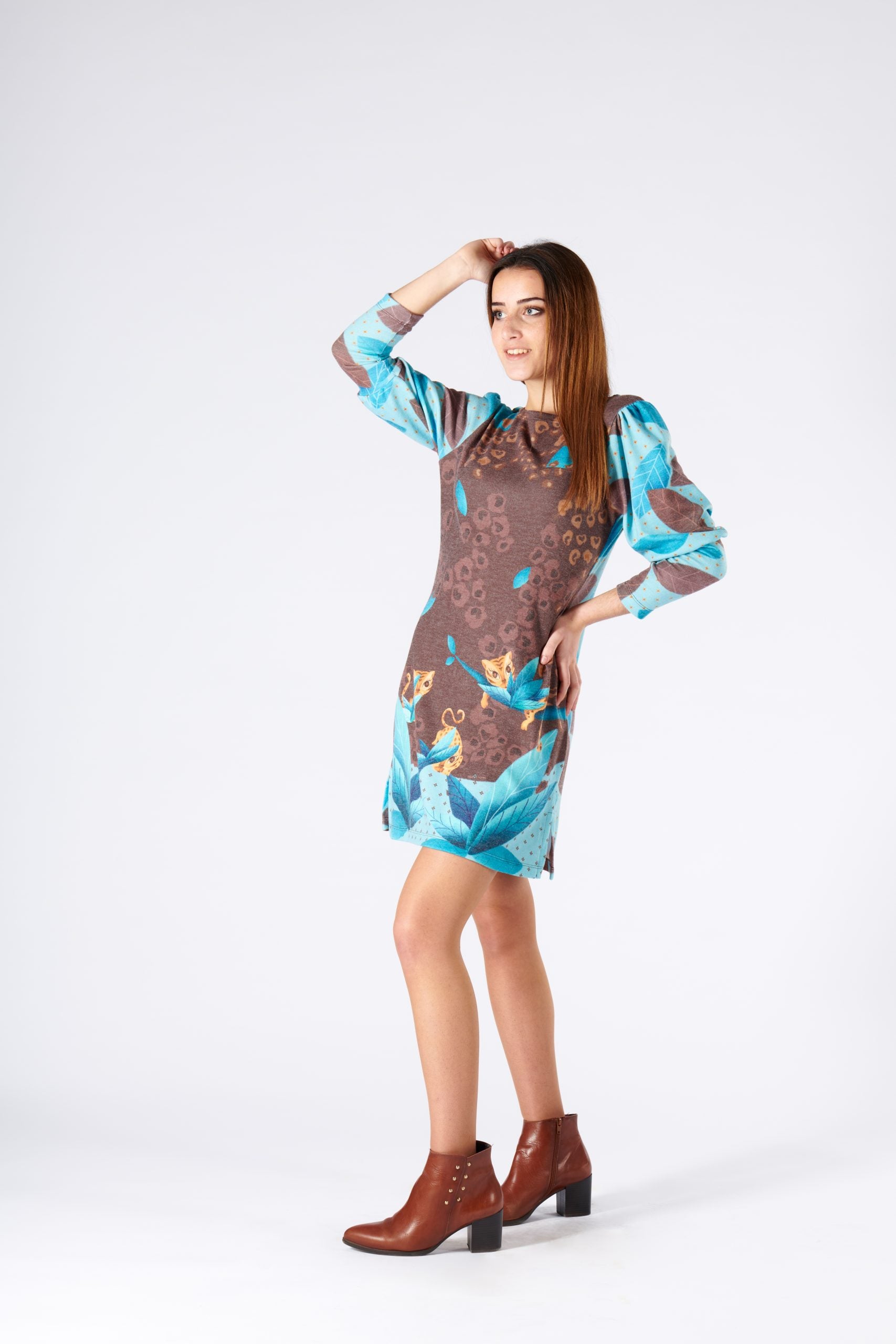 Vestido corto de genero de punto, estampado en colores azul turquesa y marrones, manga larga, manga abullonada, escote barco