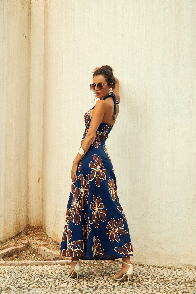 Vestido largo en azul con bordados florales en marrón y beige que capturan la esencia de la colección Camaleónica. Diseño sin mangas con cuello halter anudado que realza los hombros, complementado por una espalda generosamente escotada. La cintura destaca con una abertura decorativa adornada con tiras del mismo tejido y abalorios en marrón, creando un detalle sofisticado y movimiento. Confeccionado en mezcla de poliéster y algodón para comodidad y durabilidad. Perfecto para ocasiones especiales donde buscas un toque editorial y moderno.