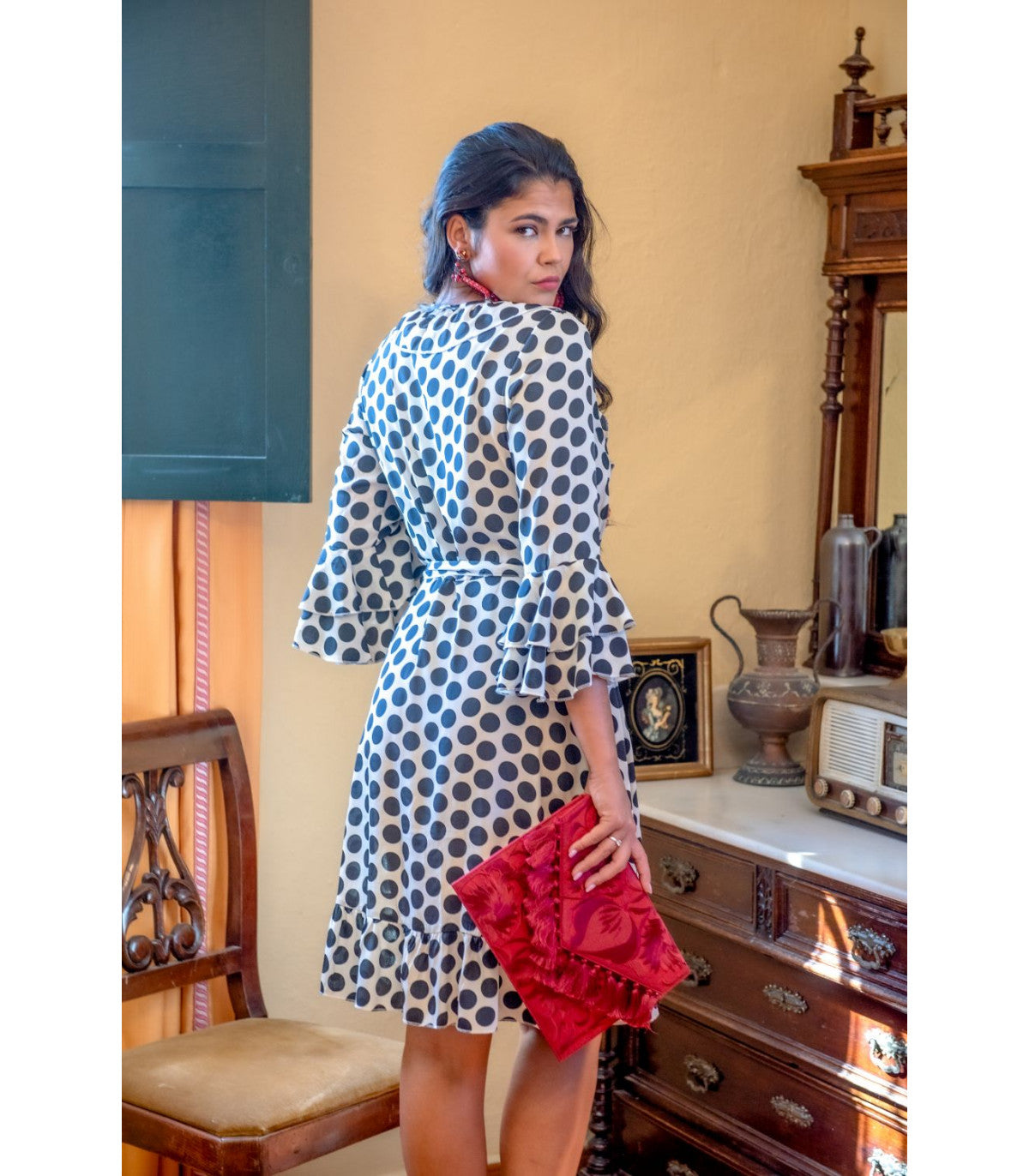 Este VESTIDO SOLERA, con su elegante escote a pico cruzado, tiene un estampado de lunares negros sobre un fondo blanco que lo hacen perfecto para cualquier ocasión. Además, los volantes añaden un toque de glamour a este vestido. Combínalo con tus accesorios favoritos para un look único y moderno.