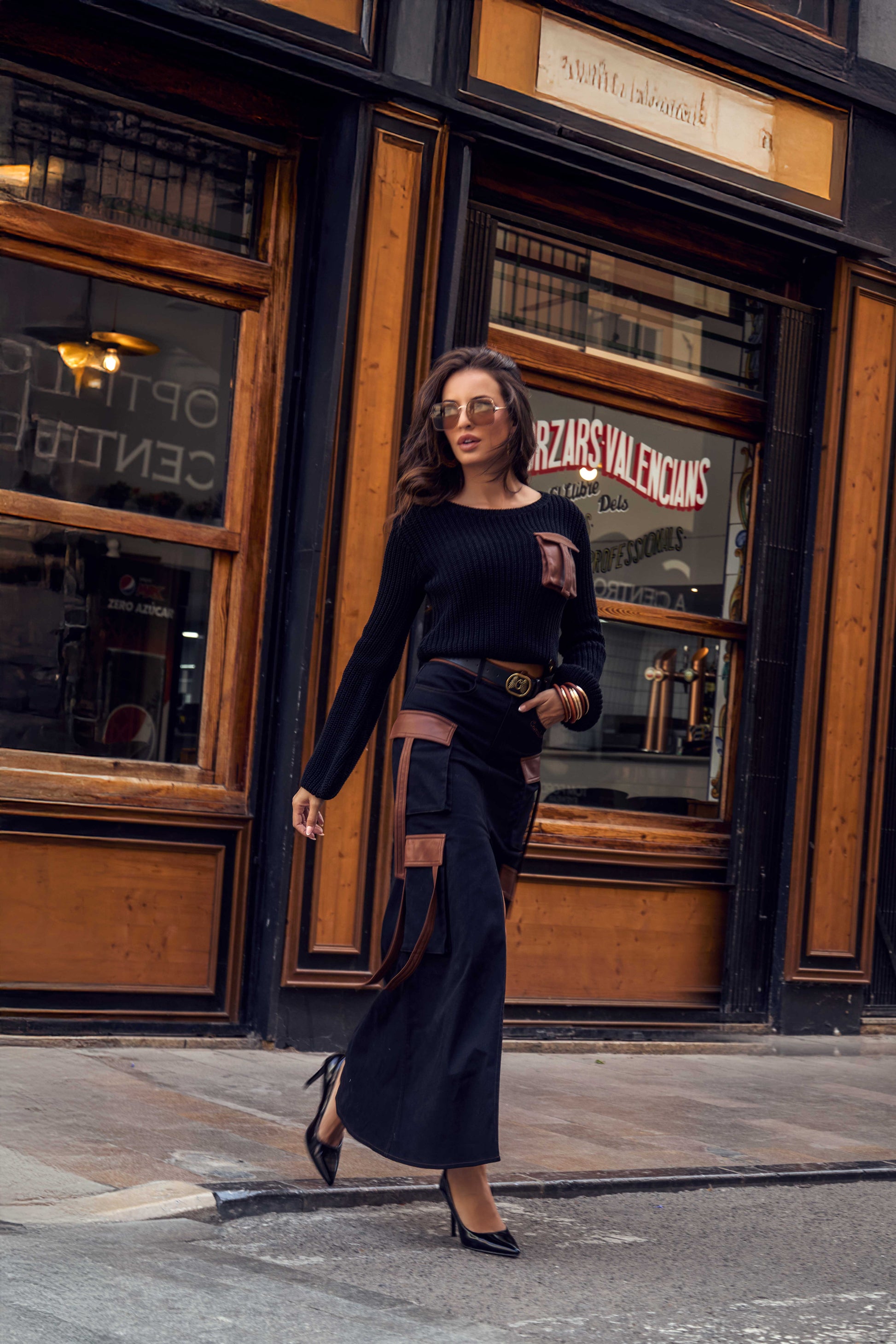 Saia comprida de ganga preta com inspiração cargo que combina funcionalidade e estilo. Destaca-se pelos seus múltiplos bolsos estrategicamente distribuídos e detalhes em pele ecológica castanha que conferem sofisticação. Possui dois bolsos laterais, abertura central e cintura em pele ecológica castanha com fecho de botão e fecho éclair. Confeccionada em denim de alta qualidade com composição de 97% algodão e 3% elastano, garante conforto e durabilidade. Uma peça versátil que funde a estética utilitária com o refinamento contemporâneo.