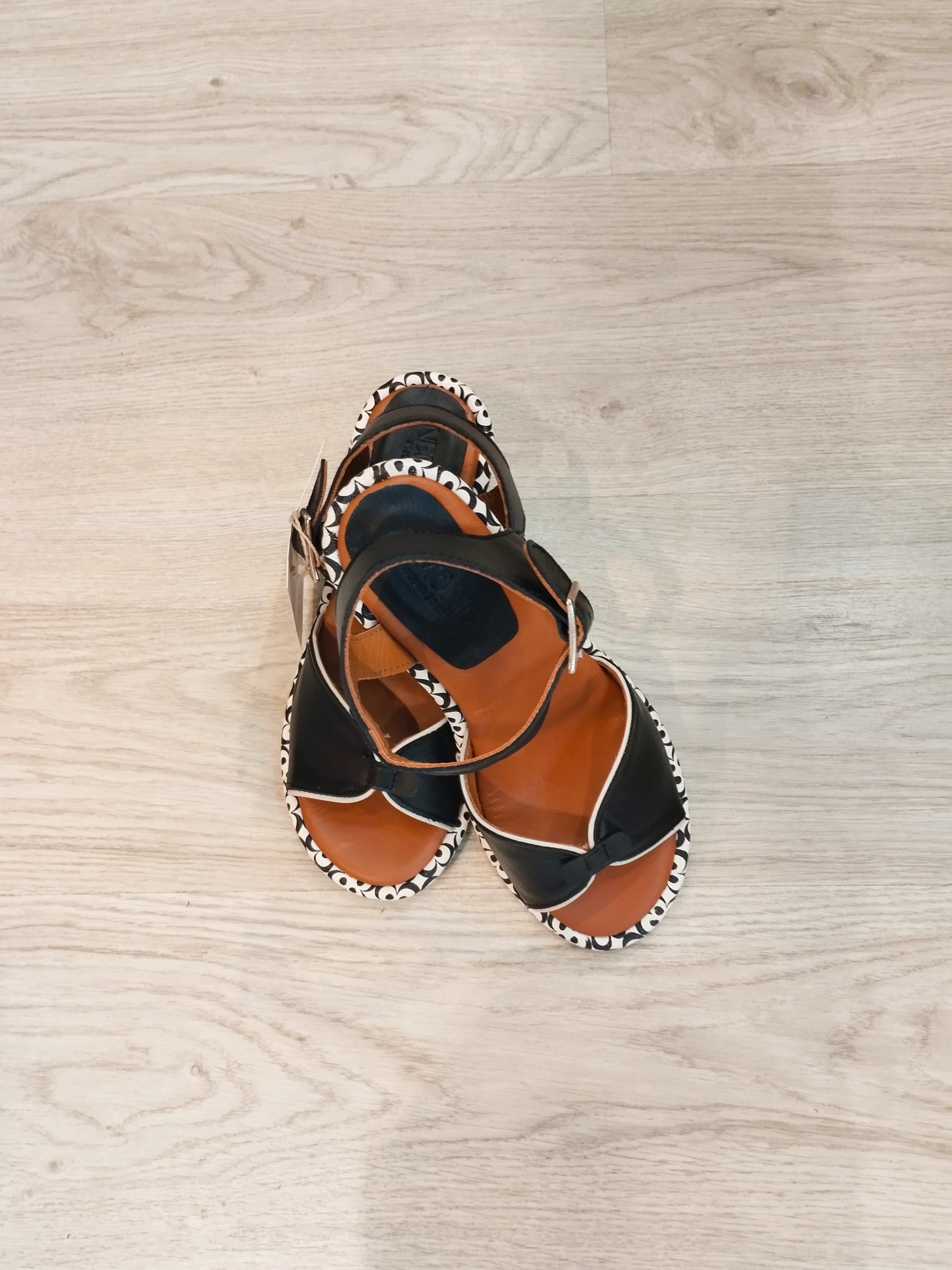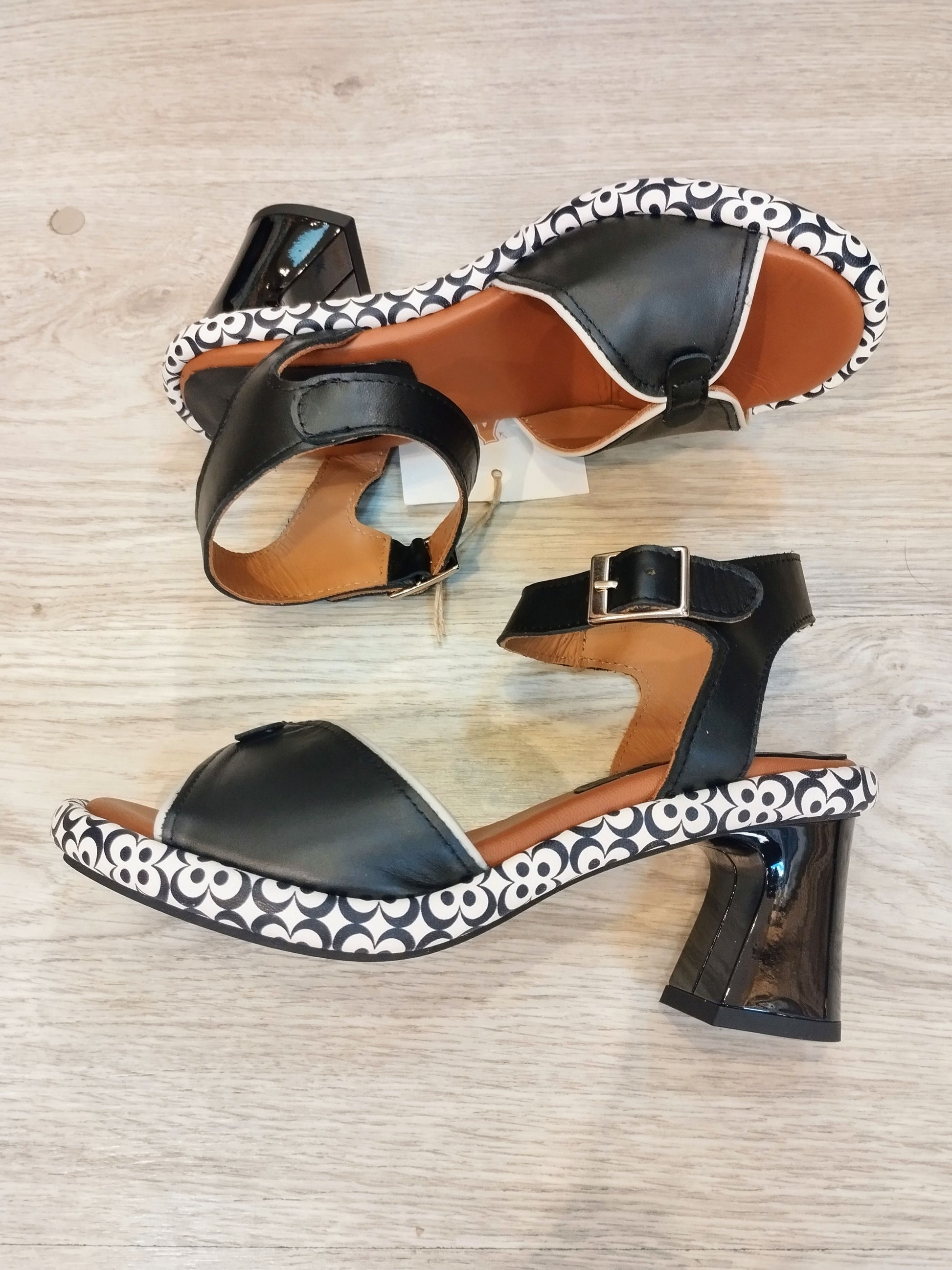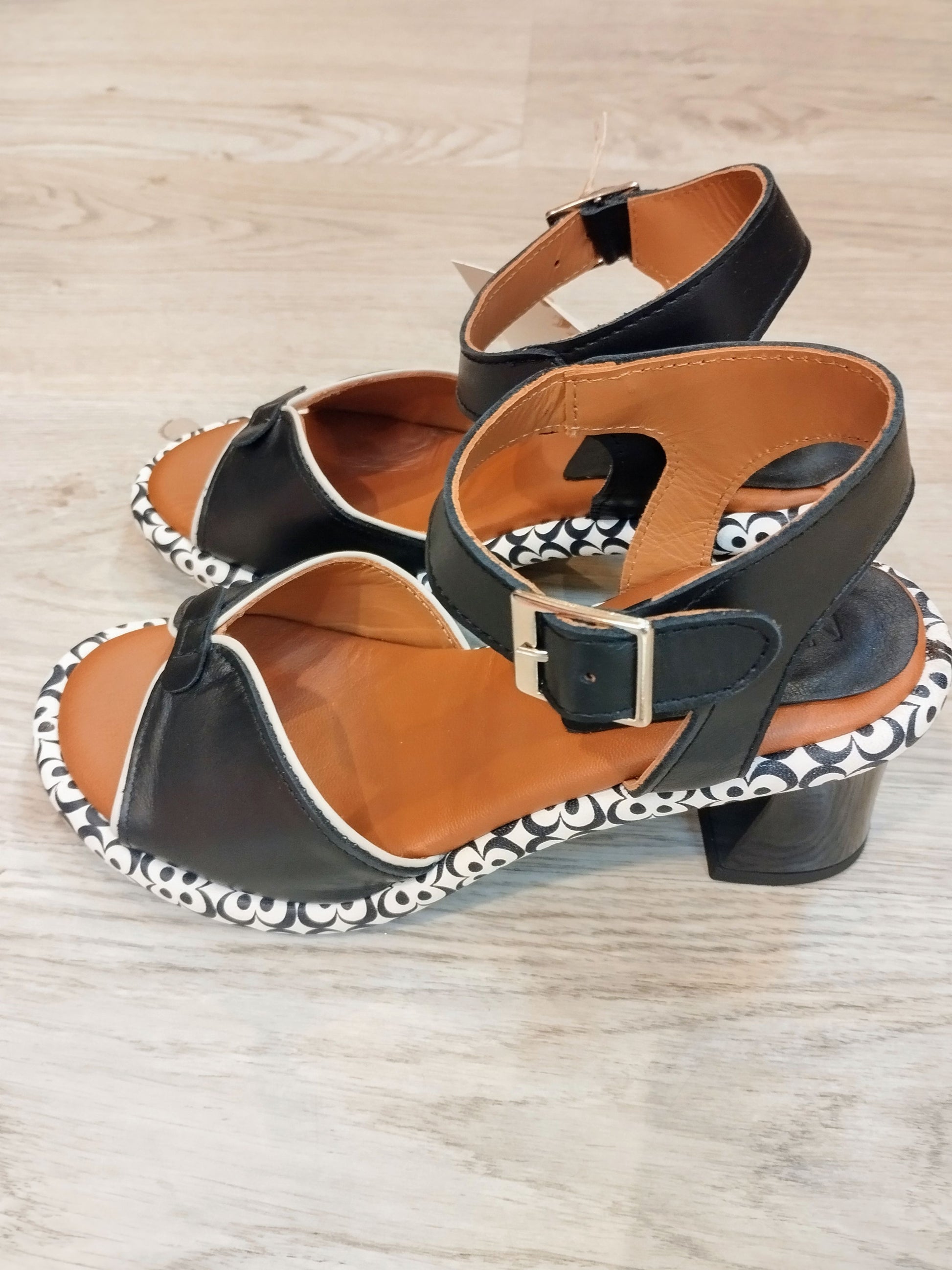 As Sandálias Dafne são um calçado em pele na cor preta, desenhadas com uma plataforma estampada a preto e branco. Este design não só proporciona estabilidade, como também melhora o conforto ao caminhar, permitindo uma melhor distribuição do peso e reduzindo a fadiga nos pés durante o uso prolongado.
